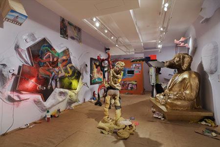 BOBO'S ON 27TH LINDSAY BEEBE MATT BERRIAN BOBO BRENT COWLEY LIZZIE FITCH JESSE GREENBERG BARKEV GULESSERIAN COLT HAUSMAN MILES HUSTON BRIAN MCKELLIGOTT ANNIE PEARLMAN ASHER PENN BEN PHELAN PIFAS TED SEFCIK Curated by BOBO (PHIL COTE, NICK PAYNE, DREW GILLESPIE) July 3 - August 1, 2008 Opening reception: Thursday July 3, 6-8 pm Summer hours: Monday to Friday, 11-6 pm (Closed: Friday, July 4) For summer 2008, Foxy Production proudly presents Bobo's on 27th, a group exhibition masterminded by performance art band Bobo. A simultaneous video-linked exhibition is being held at their space, Bobo's on 9th, in the Italian Market area of Philadelphia. The two exhibitions, under the joint title Precious Delights, mark Bobo's on 9th's first anniversary. Both shows include works by Lindsay Beebe, Matt Berrian, Brent Cowley, Lizzie Fitch, Jesse Greenberg, Barkev Gulesserian, Colt Hausman, Miles Huston, Brian McKelligott, Annie Pearlman, Ben Phelan, PIFAS, and Ted Sefcik, many of whom have presented work at Bobo's on 9th since its inauguration last year. Ryan Trecartin is exhibiting at Bobo's on 9th only, making a installation for the space's front window. Bobo's on 27th includes painting, sculpture, sound, video and publications in a riotous mix of colors, styles and materials. Underscored by interests in figuration, the ready-made, deconstruction and assemblage, the artists are generating bold new methods, ideas and aesthetics. Their works draw influences from the Internet, art history, ecology, and emerging definitions of self and community, among many other sources. Bobo have written: "The appearance of the exhibition could be best described as a germed-up concept car interface, burnt and melting. This aesthetic reinforces our existing attention to the corners of rooms where bits of dead skin rest, where the dust mites reside, but also shows our interest in how the human mind is steadily cracking codes at the base of the natural Internet, allowing us to successfully reconfigure it and our perceptions of what is possible at microbiotic and galactic levels. The earth is evolving into a throbbing brain and Bobo is interested in exposing technology as nature and nature as a fully moldable interface." Bobo have created artworks, design features and framing devices to push the boundaries and expectations of the role of gallery, curator, artist, and viewer. Their designs are both sectional: membranal wall sculptures and oversized frames made from steel-wool surround works, and environmental: the floor of the gallery is covered in burlap (in reference to the floor designs for previous Bobo shows) and littered with trash-like artworks; the walls are covered in "advertisements" for different pieces in the exhibition; and a specially constructed jukebox plays curated music and sound. LINDSAY BEEBE (Farmington CT, 1982) presents One Nightmare, an intense oil and acrylic painting that is both disturbing and engaging. Framed by Bobo in a steel wool construction, it recalls Primitivism's vigorous brush strokes and exploration of dream, allegory, and myth. Beebe has recently had a solo exhibition at Bobo's on 9th, and has shown at Brenda Taylor Gallery, New York (2006); and Acme Gallery, New Orleans (2005). Beebe has performed with the Experimental People at the ICA Philadelphia (2006); Space 1026 Gallery, Philadelphia (2006); and at the New York Underground Film Festival (2005). MATT BERRIAN (Ridgewood NJ, 1983) has produced a vivid series of paintings in acrylic that wittily portrays edgy narratives of fantasy and power-play. With a fresh comic book style, they radiate passion, desire and violence. Berrian has had a solo exhibition at Bobos on 9th (2008) where he performed with the Embracists group. He exhibited his senior thesis show at University of Art, Philadelphia in 2006. BRENT COWLEY (Los Angeles CA, 1981) has constructed a series of wall pieces that functions as an alternative history of the exhibition. He has developed characters and products that imaginatively draw together the other works in the show, and has collaborated with Asher Penn on a publication for the show. Cowley has exhibited at Kyle Kessler Gallery, Baltimore MD; Planaria Gallery, New York (2005); and the Wight Gallery, Los Angeles (2001). He has performed with Experimental People in New Orleans, New York and Philadelphia. He has had a solo exhibition at Benson Hall, Providence RI; and has curated a group exhibition at Carr Haus Gallery, Providence RI. LIZZIE FITCH (Bloomington IN, 1981) presents a sculpture capturing a body within the throes of transformation. Simultaneously multiplying, deconstructing, and reconstituting, the work compellingly re-animates figurative sculpture. Fitch had a solo exhibition at Bobo's on 9th in 2007. She has exhibited at Luswarande 08 - Wanderland, Tillburg, The Netherlands (2008); and La Triennale di Milano, Italy (2007). She has exhibited in collaboration with Ryan Trecartin at Crane Arts, Philadelphia (2007); and QED, Los Angeles (2006); and has performed with the Experimental People in New York, New Orleans, and Cleveland. JESSE GREENBERG (Morristown NJ, 1982) has made wall-based sculptures that appear like otherworldly appliances. Fabricated from a wide range of materials, including expanding foam, latex, Mylar, silicone, rubber and wood, they incorporate "touchables", independent sculptural elements that can be handled by viewers. Greenberg had a solo exhibition at Bobo's on 9th in 2007. He has also exhibited at Okay Mountain Gallery, Austin TX (2008); Louisiana Biennial, Contemporary Art Center, New Orleans (2006); The Moore Space, Miami (2006); Good Children, New Orleans (solo) (2005). He has performed widely with the Experimental People. BARKEV GULESSERIAN (London, UK, 1979) presents a huge sculpture of a golden dog-like figure. Striking a Buddhist pose, it invokes humor, spirituality, and a nostaglia for children's TV. Gulesserian has had a recent solo exhibition at Bobo's on 9th (2008). He has a