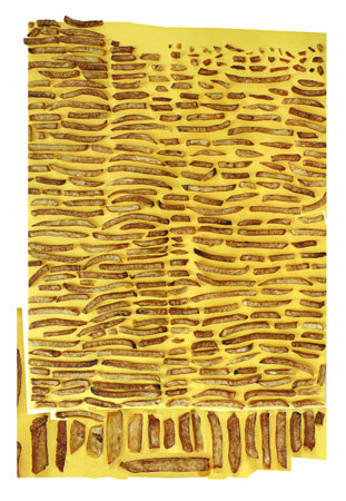 ESTER PARTEG�S MORE WORLD Extended through December 18, 2010 Opening reception: Thursday, October 21, 6-8 pm Gallery hours: Tuesday - Saturday, 11-6 pm More World, ESTER PARTEG�S' latest solo exhibition at Foxy Production, plays with perceptions of excess, anxiety, pleasure, and deprivation. More World combines wallpaper, drawings, prints, sculpture, and video in a charged environment of color and contrast. Nature within the city, packaging, and fast-food provide inspiration for the artist�s ironic takes on the psychic underpinnings of landscapes, surfaces, and objects. Parteg�s unpacks Pop, contaminating it with trash, removing its logos and references, and infusing it with a corrupted photo-realism. Private and public spheres sit uneasily together, as the artist traces the process of consumption: from the birth of desires in marketing to the final transformation of products into trash, the symbol of depletion and, perhaps, death. The walls of the gallery are covered by the monochromatic Wallpaper (Fences) (2010) with its repeating photographic images of fencing and trees. The landscape is immediately recognizable as an abandoned urban area, common to large swathes of the post-industrial American city. For Parteg�s the fence represents the division between the civilized and the wild, between order and disorder, and between the clean and the tainted; unnervingly, we cannot be sure which side of it we are on. Studies on Mysticism (2010), a series of iridescent candy package drawings, hang before the black-and-white wallpaper, creating senses of both animation and disorientation. Using airbrush and stencils - the tools of choice of pre-digital graphic designers � Parteg�s draws only the background designs, highlighting their cosmic, almost transcendental allusions, as if they were promising, with the purchase of a product, a kind of celestial reward. The works� intense coloring amplifies merchandising�s optimistic appeal, one so often undercut later by dissatisfaction and disillusion. Organized Fries (2007-2010), also hung directly onto the wallpaper, are digital prints of arrangements of French fries on brightly colored backgrounds. Parteg�s makes the humble fry � unremarkable, almost invisible in its ubiquity � the focus of attention, the essential element within the visual systems she develops. She wittily places and classifies each fry with a formal precision reminiscent of a natural history museum exhibit. Overcast (2010) are sculptural renderings of outdoor potted plants that have been covered in plastic bags to protect them from the winter weather. Their plastic covering is their protector from the elements as well as their oppressor � it seems to both constrict and suffocate. Cast in polyurethane, their leaves have a bright pigmentation that gives them an uncanny, almost surreal quality. You Are Here (Lightbox) (2006-2010) is an illuminated idyllic forest scene that on closer scrutiny may not be quite what it seems: weeds sprouting in the foreground and strange marks and printing inconsistencies reveal the scene to be a photographic screen. The image is in fact of a hoarding around a Chinese building site, masking its dirt and disruption with a vision of bucolic splendor. Perception is distorted, and flatness and depth collapse into one another as differing levels of reality refract and disorient. The silent video Ghost (2009) reflects the world through a trash-strewn puddle on a lonely industrial street. A truck rolls by, pigeons fly overhead, and an electronic advertising sign changes. Ghost distils many of the themes of More World: the odd glamour of the marginal and the discarded, the possibilities of multiple perspectives on the one subject, the trickiness of absolutes, and the experience of looking with fresh eyes upon the ordinary and everyday. As the video progresses it is clear that even the most mundane and forgotten backstreet, the so-called �non�place�, is rife with transformative activity. ESTER PARTEG�S (La Garriga, Barcelona, 1972) lives and works in Brooklyn, NY. She holds an MFA from the Universitat de Barcelona and has completed postgraduate studies in Multimedia at Hochschule der Kunste, Berlin. Exhibitions include: Whitechapel Gallery, London (upcoming)(2011); Christopher Grimes Gallery, Santa Monica, CA (solo); Socrates Sculpture Park, Long Island City, NY; Denison Museum, Granville, OH (all 2010); Brooklyn Academy of Music, Brooklyn, NY; Macro Future, Depart Foundation, Rome; Foundation CaixaForum, Barcelona (all 2009); The Aldrich Contemporary Art Museum, Ridgefield, CT (2008); Museo Nacional Centro de Arte Reina Sofia, Madrid (solo); 2nd Moscow Bienniale (both 2007). For further information or high resolution images contact the gallery: +1 212 239 2758. FOXY PRODUCTION 623 W 27 ST NYC 10001 USA +1 212 239 2758 --- FP NEWS http://www.foxyproduction.com/news/ |