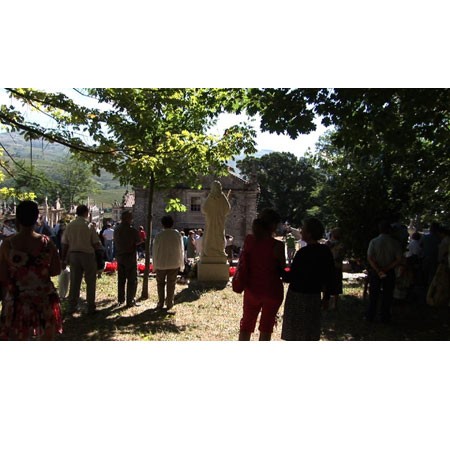 Bridget Smith: We Must Live! 9 December 2011 – 11 February 2012 In this exhibition Bridget Smith explores the power of acting out an imagined scenario and the consequences it can have in real life. Her new film and photographs examine how a particular community deals with notions of life and death and how faith is used as a refuge in moments of crisis. Filmed in a small village in Galicia, Spain We Must Live! is set around the feast day of Saint Martha – who, her devotees believe, has the power to cure serious illness. Smith’s film follows the events of the day from the religious ceremonies to the evening festivities. On this day relatives of those who have survived a life threatening illness act out a symbolic death by lying in an open coffin. The coffin is carried in a procession through the village before its occupant emerges to picnic with their family. The day itself is one of extreme noise and chaos, but the film is a meditative work about our search to connect with something greater than ourselves. We Must Live! raises questions of how much a recovery from illness can be attributed to personal faith. Bursts of clashing noise and revelry are intercut with moments of reflection and remembering. The cast of real characters have all had experience of the power of Saint Martha: the young woman who has been in the coffin, the priest who represents the views of Rome, the man who has survived a life threatening illness and the local amateur dramatic group, ‘We Must Live!’ whose acting out represents a secular version of the devotions dedicated to St Martha. Also on show are a number of photographs including two from the shrine complex at Lourdes. These empty interiors where medical staff examine whether a ‘miraculous’ cure has occurred represent sites where scientific knowledge meets religious fervour. |