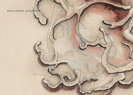 The Front Room Gallery is Proud to Present: Patricia Smith "My Terrritory is the One You Stole From Me" Opening Reception: Friday October 15th October 15th-November 14, 2010 Hours Fri-Sun 1-6 and by appt. The Front Room gallery is pleased to present a solo exhibition of new works by Patricia Smith entitled, � My Territory Is The One You Stole From Me.� In her persona as a cartographer of the psyche, Smith delves deep into the subconscious to return to the surface with a planar view of unedited impulses and allegiances, exposing unmitigated and raw internal motivations. Her delicate ink and watercolor paintings and drawings act as organic architectural plans developed from emotional inner-workings, these highly detailed works expose the confused density of the mind, clarifying the often incongruous and oppositional standpoints of decision making and alliances. There is a dark humor to Smith�s work as she turn a critical eye to the self, the atmosphere she builds through layers of stippling and washes of color complement her decisive pen-work used in defining the walls of these imagined plot plans. With these new works, the artist characterizes the physical space within the mind, mapping ideas and thoughts, giving a logical designation on paper to the intangible. Smith takes a position of authority as she uncovers the absurdity that can be found in complex reasoning and emotions, listing and verifying their structural whereabouts with certainty. In her �Structural Containment for Reactive Clandestinism� organic chambers and enclosures form this proposed system for containment and capture. Smith daringly exposes the relevant placement and wall density necessary to secure secret thoughts and issues from escape; in these schemes areas are labeled as holding fields for �Mitigated truth�, �Clouded issues� �Negotiated risk�, �Trust issues� and �Stored resentment�. Smith emboldens her standpoint of authority for the commission of these plans with marked plot plan numbers and stamps such as used to approve building plans, but in an act of misdirection, Smith alters the terms stamped to such statements as ��recalcitrant� or �no fame, no shame�. This is Patricia Smith�s third solo exhibition at the Front Room gallery. She has exhibited extensively throughout Europe and the United States. In October her work will be featured in �Zweierlei� at Ausstellungsraum Klingental in Basel, Switzerland. |