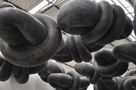 English below Michael Sailstorfer Knoten Wie Wolken N�s Como Nuvens A Fortes Vila�a inaugura sua programa��o de 2010 com a primeira exposi��o individual do alem�o Michael Sailstorfer no Brasil. Em Knoten Wie Wolken, N�s Como Nuvens, o jovem artista apresenta uma grande instala��o feita com dezenas de c�maras de ar, uma s�rie de esculturas de alum�nio em forma de n�s e um filme em 16 mm. Em N�s como nuvens, Sailstorfer utiliza-se de dezenas de grandes c�maras de ar de borracha preta, entrela�adas em n�s de duas e tr�s camadas e suspensas como �nuvens negras�. Neste trabalho, desenvolvido especialmente para o espa�o do Galp�o, Sailstorfer retoma o uso de materiais industriais caracter�stico de sua obra. Mas se na vida cotidiana estes pneus estariam em movimento constante e em permanente desgaste, aqui eles ganham o ar, ficam em estado de permanente suspens�o. A oposi��o entre movimento e in�rcia tamb�m permeia o grupo de esculturas presentes na exposi��o. Nestes trabalhos, o artista toma como ponto de partida diferentes n�s feitos com cordas grossas. Utilizando-se de moldes, ele substitui o material que d� origem �s formas � das cordas, pelo alum�nio fundido. O n�, male�vel em sua ess�ncia, ganha rigidez na escultura. S�o n�s que n�o podem mais se desfazer, formas escult�ricas fechadas, que encerram uma id�ia. O filme mostra um galp�o cujas paredes est�o em permanente estado de expans�o e retra��o, como se v�ssemos um pr�dio inteiro respirando. Sailstorfer filmou a explos�o deste galp�o em alta velocidade, um recurso que resulta num efeito c�mera lenta quando vemos o filme projetado em velocidade normal. Em seguida, ele removeu as partes do filme em que ver�amos o pr�dio explodir e editou os movimentos de expans�o e retra��o numa sequ�ncia de repeti��es. Se a simplicidade das formas arquitet�nicas revela um pensamento escult�rico por tr�s da c�mera, as rela��es temporais de movimento e suspens�o estabelecem tamb�m um di�logo frut�fero com os outras obras em exposi��o. Em 2009, Michael Sailstorfer teve uma exposi��o individual no PS1 MOMA, New York. Participou de in�meras coletivas internacionais importantes como New York The Quick and the Dead, no Walker Art Center, Minneapolis, em 2009; Made in Germany, Kestnergesellschaft, Kunstverein, Sprengel Museum, Hannover, em 2007; Still Life: Art, Ecology and the Politics of change, Sharjah Biennial; Bienal de Moscow em 2007; Trienal de Yokohama, em 2005, e Bienal de Liverpool em 2004. No Brasil, Sailstorfer participou da coletiva inaugural do Galp�o Fortes Vila�a, a mostra God is Design, em 2007. Michael Sailstorfer Knoten Wie Wolken [Knots Like Clouds] Fortes Vila�a is starting off its 2010 schedule of exhibitions with the first solo show by German artist Michael Sailstorfer in Brazil. In Knoten Wie Wolken [Knots Like Clouds] the young artist presents a large installation made up of dozens of tire inner tubes, a series of aluminum sculptures in the form of knots, and a 16-mm film. In Knots Like Clouds, Sailstorfer uses dozens of large black inner tubes intertwined in knots and suspended at different levels like �black clouds.� In this work, developed especially for the Galp�o�s space, Sailstorfer has gone back to using the industrial materials characteristic of his oeuvre. But if in daily life these tires would be in constant movement and undergoing continuous wear, here they have taken to the air, in a state of permanent suspension. The opposition between movement and inertia also pervades the group of sculptures present at this show. The artist has based these artworks on different knots tied in thick ropes. Through the use of molds, he has substituted the material � the ropes � that gave rise to the form. The knot, an essentially malleable object, gains rigidity as aluminum sculpture. With no possibility of ever being untied, these knots are now closed sculptural forms, giving fixed embodiment to an idea. For its part, the film shows a warehouse whose walls are continuously expanding and contracting, as though we were watching the entire building breathe. Sailstorfer filmed the explosion of this warehouse at high speed, a technique that results in a slow-motion effect when we watch the film projected at normal speed. He then removed the parts of the film in which we would see the building explode, and edited the movements of expansion and contraction to create a repetitive sequence. While the simplicity of the architectural forms evinces a sculptural thinking behind the camera, the temporal relations of movement and suspension also establish a productive dialogue with the other artworks in the exhibition. In 2009, Michael Sailstorfer held a solo show at PS1 MoMA, New York. He has participated in countless important international group exhibitions such as The Quick and the Dead, at Walker Art Center, Minneapolis, in 2009; Made in Germany, at Kestnergesellschaft, the Kunstverein Hannover, and Sprengel Museum Hannover, in 2007; Still Life: Art, Ecology and the Politics of Change, the Sharjah Biennial; the Moscow Biennial in 2007; the Yokohama Triennial, in 2005; and the Liverpool Biennial in 2004. In Brazil, Sailstorfer participated in Galp�o Fortes Vila�a�s inaugural group show God Is Design, in 2007. |