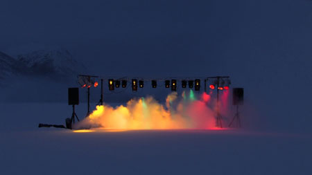 Kevin Schmidt 17. - 31. Januar 2009 Private View: Friday, 16. January, 7-9 pm Galerie Barbara Thumm Markgrafenstrasse 68 Galerie Barbara Thumm is pleased to announce the first solo show by Canadian artist Kevin Schmidt, presenting his video installation Wild Signals. Wild Signals shows a stage rig, installed in an uninhabited, snowy mountain landscape, where as if by magic the music and lights start to play. It is the minimalist, five-note sequence of sounds that served to communicate with extraterrestrials in the Hollywood classic Close Encounters of the Third Kind (Steven Spielberg, 1977). Spielberg based this on scientific sound and color experiments of the 19th century, as for example Jean-Fran�ois Sudre�s musical language Solresol: the model of a universal, tone-based system of communication. In Kevin Schmidt�s installation the static scenery is counteracted by various interpretations of the sequence of sounds, the colorful play of the spotlights, and artificial fog patches. Wild Signals is a lonely rave, an imaginary stage, a theatrical event, whereas the viewer solely witnesses the spectacle and is left with his own expectations. Wild Signals is a mediation between technology's artificial relationship to nature and the individual's own capacity to meet these terms. (*Textauszug, vgl. auch Pressetext der Ausstellung �Wild Signals�, W�rttembergischer Kunstverein Stuttgart 2008) --- Wir danken der Catriona Jeffries Galleries, Vancouver f�r die Zusammenarbeit. / We like to thank Catriona Jeffries Galleries, Vancouver for the kind collaboration. Kevin Schmidt 17. - 31. Januar 2009 Er�ffnung am Freitag, den 16. Januar, 19�21 Uhr Galerie Barbara Thumm Markgrafenstrasse 68 Die Galerie Barbara Thumm freut sich, in der ersten Einzelausstellung die Videoinstallation Wild Signals des kanadischen K�nstlers Kevin Schmidt pr�sentieren zu k�nnen. Wild Signals zeigt ein B�hnenrigg (B�hnenaufbau) in einer unbewohnten, verschneiten Gebirgslandschaft; scheinbar von Geisterhand beginnen die Musik und Lichtorgel zu spielen. Es ist jene minimalistische, auf f�nf T�nen basierende Klangfolge zu h�ren, die in Steven Spielbergs Filmklassiker Unheimliche Begegnung der dritten Art (1977) der Kommunikation mit den Au�erirdischen diente. Spielberg bezog sich wiederum auf wissenschaftliche Farb- und Klangexperimente des 19. Jahrhunderts wie etwa des Musikers Jean-Fran�ois Sudre, der eine aus T�nen konstruierte Universalsprache namens Solresol schuf. In Kevin Schmidts Installation wird die statische Szenerie mit diversen Interpretationen der Klangfolge, dem Lichtspiel der Scheinwerfer sowie k�nstlichen Nebelschwaden durchkreuzt. Wild Signals ist ein einsamer Rave, eine unwirkliche B�hne, eine theatralischer Inszenierung, wobei der Betrachter als einziger Zeuge des Spektakels auf seine eigenen Erwartungen zur�ckgeworfen wird. Wild Signals versucht zwischen der k�nstlichen Beziehung von Technik und Natur und der Kapazit�t des Einzelnen, diesen Bedingungen zu entsprechen, zu vermitteln. |