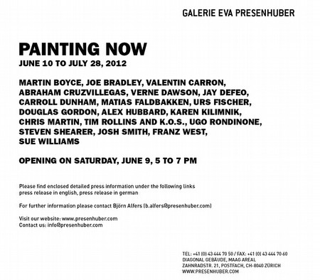 PAINTING NOW MARTIN BOYCE, JOE BRADLEY, VALENTIN CARRON, ABRAHAM CRUZVILLEGAS, VERNE DAWSON, JAY DEFEO, CARROLL DUNHAM, MATIAS FALDBAKKEN, URS FISCHER, DOUGLAS GORDON, ALEX HUBBARD, KAREN KILIMNIK, CHRIS MARTIN, TIM ROLLINS AND K.O.S., UGO RONDINONE, STEVEN SHEARER, JOSH SMITH, FRANZ WEST, SUE WILLIAMS June 10 2012 - July 28 2012 As a sequel to last summer’s successful “Sculpture Now” exhibition, Galerie Eva Presenhuber is pleased to present the group show “Painting Now” featuring artistic positions that reflect current trends in painting. For further information please contact Björn Alfers or Florian Keller at Galerie Eva Presenhuber. Opening on Saturday, June 9, 5 to 7 pm. |