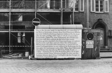 Positions on Conceptual Art Giovanni Anselmo, Robert Barry, Martin Boyce,Daniel Buren, Martin Creed, Ludger Gerdes,Liam Gillick, Jack Goldstein, Dan Graham,Rodney Graham, Douglas Huebler, On Kawara,John Knight, Joseph Kosuth, Jiri Kovanda,Sol LeWitt, Goshka Macuga, Richard Nonas,Pamela Rosenkranz, Ian Wilson, Lawrence Weiner 03 Februar 2012 – 17 März 2012 Eröffnung: Donnerstag, 02 Februar 2012, 19–21 Uhr Positions on Conceptual Art Die Bezeichnung Concept Art ist erstmalig Anfang der 1960er Jahre im US-amerikanischen Kontext auf Kunst angewandt worden, deren eigentliches Merkmal die Sprache ist. Sol LeWitt prägte durch seine Texte die Bezeichnung Conceptual Art, die seitdem für eine Kunstrichtung steht, in der das Konzept, die Idee des Kunstwerks, vorrangig ist. Die Ausführung des Kunstwerks spielt eine untergeordnete Rolle und muß nicht zwingend durch den Künstler selbst erfolgen. Oft treten Modelle, Skizzen, Schriften und Anleitungstexte an die Stelle des ausgeführten, somit entmaterialisierten Werkes.Der Betrachter wird veranlasst, sich mit dem Künstler und seinem Denken auseinander zusetzen. Ein Schwerpunkt der Galerie Rüdiger Schöttle liegt seit den 1970er Jahre in der Vermittlung konzeptueller Kunst. In der Ausstellung Positions on Conceptual Art wird nun dieser Kerngedanke der Galerietätigkeit aufgegriffen. Es werden sowohl Kunstwerke der prägenden, ersten Künstlergeneration wie etwa Robert Barry, Dan Graham, Douglas Huebler, On Kawara, Joseph Kosuth, Lawrence Weiner, als auch bedeutende konzeptuelle Positionen der nachfolgenden Generationen wie Martin Boyce, Martin Creed, Liam Gillick, Goshka Macuga u.a. gezeigt. Damit soll nicht nur ein wichtiger Punkt des Galerieprogrammes über die Jahre hinweg beleuchtet, sondern vor allem auf die fortwährende, zentrale Bedeutung konzeptueller Kunst verwiesen werden. Neuigkeiten Anri Sala vertritt Frankreich bei der 55. Biennale Venedig, Juni 2013. Wir möchten weiter auf zwei besondere Einzelausstellungen im Haus der Kunst München hinweisen: Wilhelm Sasnal: 03.02. – 13.05.2012 Thomas Ruff: 17.02. – 20.05.2012 Der Kunstverein München zeigt ab dem 18. Februar 2012 Werke des niederländischen Künstlers Willem de Rooij. - Positions on Conceptual Art The term Concept Art was first used at the beginning of the 1960s in the context of American modern art for the kind of art that essentially operates with language to express an idea. One of its chief exponents was the American artist Sol LeWitt, whose use of texts in his work led to the widespread use of the term Conceptual Art to describe an art movement for which the idea, the concept, is more important than the work itself. Indeed, the execution of the artwork is subordinate to the idea and need not even be undertaken by the artist himself. In many cases the work merely consists of models, sketches, texts and instructions in lieu of the actually executed artwork, thus transcending the work’s physical, material presence still further.Consequently, with little else to distract him, the viewer’s attention focuses on the artist himself and his thoughts and ideas.The communication of Conceptual Art has been one of the main activities of the Rüdiger Schöttle Gallery since the 1970s. Thus it is that the exhibition Positions on Conceptual Art now takes up one of the gallery’s fundamental objectives. It will show not only works by the leading exponents of the first generation, such as Robert Barry, Dan Graham, Douglas Huebler, On Kawara, Joseph Kosuth, Lawrence Weiner, but also works by important Conceptualists of the following generations, including Martin Boyce, Martin Creed, Liam Gillick and Goshka Macuga, to name only a few.Besides illuminating a longstanding aspect of the gallery’s activities, the exhibition’s main objective is to highlight the enduring and central significance of Conceptual Art within the context of contemporary art and its history. News Anri Sala will represent France at the next biennial Venice, June 2013. We are pleased to annouce two solo exhibitions at Haus der Kunst Munich: Wilhelm Sasnal: 03.02. - 13.05.2012 Thomas Ruff: 17.02. - 20.05.2012 Kunstverein Munich: Willem de Rooij, Opening 18.02.2012. |