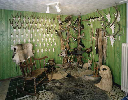 Uro� Acman Museums June 30 - July 15, 2009 You are kindly invited to attend the opening of the exhibition on Tuesday, 30 June at 8 pm at �kuc Gallery. In a series of photographs entitled Museums Uro� Acman documents so-called hunting trophy rooms. Monumental and distant photographs reveal an objective and cold picture, while the bizarre motif functions as an ironic subtext, which gives them an alienating effect. The artist began recording these unusual places quite coincidentally. He says that when seeing one of these 'private museums' for the first time, he felt an odd fascination with the people who spend all their free time arranging collections of stuffed animals. He came to the conclusion that these rooms are almost sacred places for them, which show their specific relationship to nature, which they bring home in bits and pieces. With regard to form, the artist is interested in examining still-life, which offers new meanings, something symbolic, only if the gaze is directed to it. Therefore, photographs make us think of the metaphorical meaning of the spaces portrayed, and their cultural, social and ideological functions. The large-format colour photographs, in the tradition of the 'post-D�sseldorf' school, pay much attention to details, composition and light. The cold images of interiors filled with hunting trophies, which the artist portrays with restrained minimalism, act as a formal counterpoint to the homey decor overload in the motif. Due to this contrast, the viewer perceives them as distant and threatening. One could say that the polished and shiny 'after-images' create a vacuum of a cold, floating simulacrum, and symbolise our erroneous encounter with the real. Through shiny flatness and seriality (a common form of artistic articulation in post-modern photography) Acman's practice sees this traumatic situation as an obsessive fixation on the object. This extends the concept of paradox not only to the images (with their effect and absence), but also to the viewers, who can neither identify with the images (a prevailing characteristic of modernistic aesthetic), nor distance themselves from them. Some contemporary photography is marked by the so-called allegoric split of the image, which increasingly approaches cultural-political intervention. Consequently, the status of the photographer/artist also changes, becoming that of photographer/ethnographer. In this context, the central focus of artistic examination is still the bourgeois capitalist art system, with its excluding definitions of art, artist, identity and community. This second, embedded, meaning brings Acman close to institutional criticism, as it questions the institution of the museum in the modern age. One of the more general definitions of the museum is a place of memory, where everything relevant, precious and significant is collected. Museums are also graveyards of objects. What is kept in a museum ceases to have any function in life, and is therefore dead. Heaven for objects is not much different from a vampire sepulchre, and this is in tune with the general dynamics of the modern age, as already established by Boris Groys. Acman's images of rooms where 'preserved' animal bodies are kept can be understood as an allegory for the contemporary museum, where the commodified art work loses its emancipatory potential and functions only as a dead relic of (art) history. Acman's Museums examine the ambiguous status of art work, which in the post-modern age spans between discourse and documentarism, nature and culture, and the avant-garde and kitsch. Curator: Iztok Hotko Uro� Acman was born in 1982 Slovenj Gradec. In 2003 he graduated in photography from the FAMU in Prague. In 2008, he completed post-graduate studies in visual communications and photography at �cole cantonale d'art de Lausanne/ ECAL in Lausanne. He is currently a student at Koper Faculty of Humanities. He has exhibited at many solo and group exhibitions in Slovenia and abroad. For further information contact curator Iztok Hotko on iztok.hotko@ gmail.com. �kuc Gallery program is funded by Ministry of Culture of the Republic of Slovenia and Cultural Department of the City of Ljubljana. |
