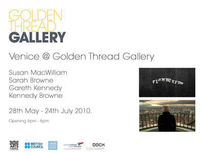 Venice @ Golden Thread Gallery 28th May - 24 July Venice @ Golden Thread Gallery launches on Friday 28th May 2010 at 6pm. The exhibition features a joint presentation of the exhibitions which represented Northern Ireland and Ireland at the world�s most prestigious visual arts showcase, the Venice Biennale, at Northern Ireland�s leading international contemporary art gallery. The exhibitions from Northern Ireland and Ireland at the 2009 Venice Biennale showcased the work of Susan MacWilliam (Northern Ireland) and Sarah Browne, Gareth Kennedy and a Kennedy Browne collaboration (Ireland). The Golden Thread Gallery is pleased to bring this work to audiences in the North of Ireland for the first time. Susan MacWilliam�s presentation for Northern Ireland at the Venice Biennale was organised and funded by the Arts Council of Northern Ireland and the British Council and was curated by Karen Downey. MacWilliam is one of the leading artists to emerge from the North of Ireland in the last decade. The Golden Thread Gallery will present her Venice commissioned video work F-L-A-M-M-A-R-I-O-N. Centering on the events of a 1931 s�ance the work reflects her fascination with the world of the paranormal and raises questions about the possibilities and limitations of language, vision and representation. Ireland�s presentation in Venice was an initiative of Culture Ireland and the Arts Council/An Chomhairle Eala�on. The exhibition curated and commissioned by Caoimh�n Corrigan, featured solo and collaborative works by Sarah Browne and Gareth Kennedy. Aspects of contemporary Ireland feature strongly in their works, which address issues of identity, labour, globalisation, economics, language, materiality and the construction of social space. Venice @ Golden Thread Gallery continues until the 24th July 2010. Project Space Small Wonder 3rd - 17th June Small Wonder is a collaboration between JEMA (The John Erickson Museum of Art) and the Golden Thread Gallery and explores the space between the realm of the imaginary and the miniature. The exhibition combines work produced for JEMA�s Next Chapter, paper works based on the miniature Museum�s plans that will eventually combine to form a book, and two new works by Fiona Larkin, developed directly from her JEMA Next Chapter project. Curated by Brendan Jamison, Sarah McAvera and Eleanor Phillips, the exhibition presents an alternative viewing of JEMA�s paper works alongside Fiona Larkin�s sound work The Listeners (Museum Whisperers) and performance The Woman Flag. A New work by Fluxus artist Ben Patterson Bollywood Love: Object of Desire will also be on display in the JEMA gallery. Next Chapter The JEMA Next Chapter spaces re-envision a page as a site for a museum project space. Artists were invited to produce work for the space provided, free of a specific theme. The notion that 'hypothetical thinking is still a form of reality' was a guiding force in the operation and conception of this project. The project includes 28 artists, of which 16 are Belfast-based and another set of the works produced will be on show at the Raccolte Frugone museum in Genoa, Italy. JEMA Director Sean Miller will be in Belfast on Tuesday 8th and Wednesday 9th June to present performances and collage projects with JEMA's giant rubber stamp and the JEMA walking stick galleries that will be toured throughout the streets of Belfast. The walking tour will depart from the gallery at 12pm on Tuesday 8th June. Fiona Larkin: The Listeners (Museum Whisperers) / The Woman Flag For The Listeners (Museum Whisperers) Larkin has recorded the internal musings of the gallery audience. They don�t tell you what to think but offer you an insight into the musings of others as they peruse the museums cultural offerings. These audio guides turn the voice of knowledge and authority on its head. This voice is internal, honest, not always comprehensive. The gaps leave a space for us to explore our own thoughts and musings in response to what we see. The Woman Flag subverts our pre-conceived notions of a flag as a banner for advertising, identity, a way or raising awareness of the museum. As an emblem it bears little relationship to museum audience and stands towering above. For the purpose of the exhibition it will be brought down to earth and made human, animated beyond its usual function. This performance will take place on Friday 4th June between 10.30am and 14.30pm. Northern Ireland Press Photographers Association Awards Exhibition 1st � 20th July 2010. The Golden Thread Gallery presents the Northern Ireland Press Photographers Association Annual Awards Exhibition. Every year NIPPA launches its search for the best photo journalists in the province. Through the BT Northern Ireland Press Photographer of the Year competition the outstanding work of Northern Ireland�s press photographers is duly recognised and rewarded. Not to be missed. |