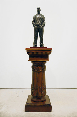 Angell Town Tom Price 8 April 2011 - 14 May 2011 Private View: Thursday 7 April 2011, 6-9pm Hales Gallery is pleased to present its first solo show with London based Sculptor Tom Price. Angell Town features five works, all figures of similar proportion and scale placed upon salvaged, revitalised and adapted plinths. Price has imbued each character with a seemingly plausible and believable persona however they are all fictional hybrid identities. Each figure is invented and constructed with the help of people he has observed on the street or from magazine images and from looking at neoclassical and classical sculpture. All of the figures are male, black and clothed in simple contemporary attire. Price has also vested them with the �accessories of modernity�; the telltale bulge of a mobile phone tucked into a pocket, the branded training shoes and a corporate name badge pinned to a jacket. The facial expressions are also carefully crafted; with all five men looking as if they are in a state of contemplation. Price�s figures have their origins rooted in Classicism and more recently Neoclassicism, however he subverts the idealised bodies of Greek and Roman sculpture, instead presenting us with modern archetypal figures. The effect challenges the viewer to examine simultaneously, both their symbolic place as part of a western culture and the role of the black male in the history of sculpture. The rejuvenated plinths on which these figures sit have been modified by Price with coats of varnish and gloss paint. One can imagine these columns gracing the corridors of power, in a bank building or Cathedral. Price cleverly uses their decrepit pomp by placing them below his �Ordinary Joes� and in doing so tests the viewer�s expectations and questions past hierarchies in sculpture. The titles of the works, and indeed the name given by Price to the show, Angell Town, encourage the viewer to develop a mental construct of these characters, where they live and what they do. Each figure is given a geographic identity based in the areas of London where Price has lived and worked for a considerable time. These are low rent areas that are not only the places that artists often choose for studios but also the historic bases for London�s immigrant community; Hackney, Brixton, Dalston, Deptford. The titles suggest a romanticised view of the city and its inhabitants, akin to the characterisation and locale portrayed in a Charles Dickens novel. Often, Price will use a street name with historic gravitas or mythic qualities, such as Achilles Street, making the ordinary sound heroic and the fabled appear normal. Price�s mother is White British and his father Black Jamaican. This has put him in an interesting position in relation to the traditions of western sculpture, which he manipulates, performing a volte-face from the stance taken by many modernists influenced by tribal sculpture. In this way, his sculpture manages to be both traditional in materiality and progressive in its cultural and conceptual significance. Price studied at the Royal College of Art in 2006. He was the Arts Council England, �Helen Chadwick Fellow� at the University of Oxford and at the British School at Rome in 2008/9. He has recently been featured as part of the BBC programmes, How to Get a Head in Sculpture (2010) and Where is Modern Art Now (2009) |
