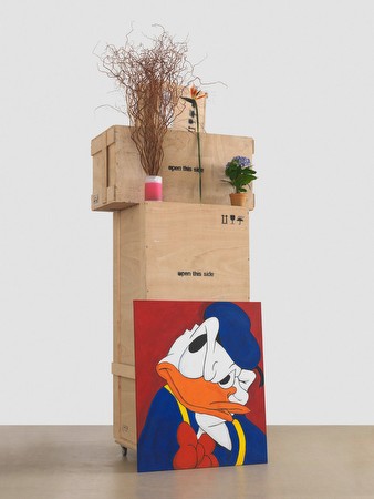Wooden crates, acrylic on canvas, plastic, glass, dried branches, artificial flowers, casters 356 x 120 x 120 cm. Stefan Altenburger Photography Z�rich |