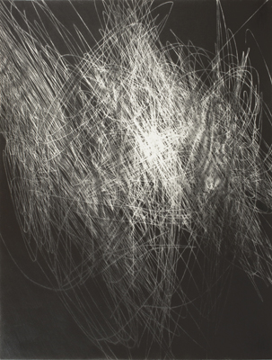The title of the exhibition, Project Scratch, refers to the artist's process of developing compositions on the computer, scratching away lines from monochromatic overlays that gradually reveal background imagery. Duty sought to reverse the foreground sensibility characteristic of painterly abstraction, wherein lines (or brushstrokes) are typically placed as artifacts on a ground. Instead of adding lines, he took them away. The result was a sort of scribble with nocturnal overtones and deep contrasts in light and contour. From these computer compositions and additional sketches, he then made drawings with multiple layers of graphite.