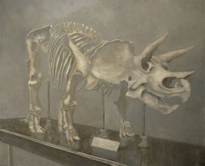 A 1970s encyclopedia and old natural history catalogues served as source material for some of the works. Two paintings by Shetabi feature dinosaur skeletons presented in period museum settings. In Afterimage, Brontosaurus, the dinosaur stands on four legs with its tail dragging behind it. In reference books and memory, these creatures remain fixed in their time, even as our knowledge of them has changed. What were once accepted models take on new lives as relics.