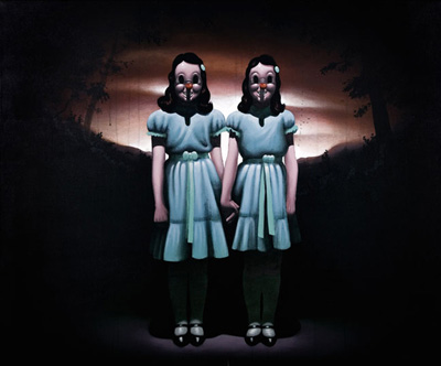 In his first Los Angeles exhibition, Castillo�s deftly painted subjects are usually children wearing eerie white masks that bring to mind classic horror films and childhood nightmares. The children interact with animals and each other in a surreal and sinister cartoon world where toys become weapons, and brutality is gleeful. They are often painted against rich black backgrounds, lit only by the flames below them, or at an ambiguous dusk/dawn before baroque landscapes.