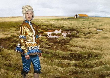 Cindy Sherman exhibits new, large-scale works that depict outsized enigmatic female figures standing in striking isolation before ominous landscapes. Looking directly out of the picture in our direction, each character is an eccentric specter, whose epic scale, vivid Chanel costumes and intense gaze suggests a sentry standing between the viewer and the distant background. Rather than staging scenes in her studio or using projected images, the dramatic landscape backgrounds were all photographed by Sherman and then manipulated in Photoshop to achieve a painterly effect. She photographed herself fully costumed, but without makeup, against a green screen and after the fact completed the images by digitally manipulating her features and altering the landscapes. The relationship of the women in these works to the landscapes they inhabit varies, with some characters appearing as if they inexplicably landed in an alien environment and others seemingly guarding their own fabled land.