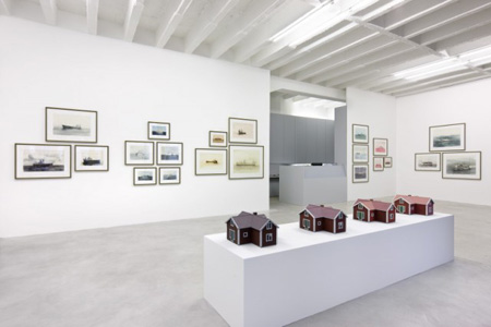 JOHAN THURFJELL DEAD CALM OCTOBER 18 - NOVEMBER 14, 2008 Galerie Nordenhake is pleased to present a solo show with new works by Swedish artist Johan Thurfjell. The exhibition�s title, �Dead Calm� comes from a shipping term describing a weather condition indicating a storm pulling up ahead and suggests a foreboding and an unknown yet imminent threat. Thurfjell�s works are often characterised by an interaction between visual form and subtextual narrative. Thurfjell uses his own personal experiences as an aesthetic tool in many of his works, which are often constructed as exquisitely crafted sculptural models. The work �Goodnight Mom, Goodnight Dad� consists of four apparently identical wooden models of his parent�s summerhouse. A closer inspection reveals that the houses are gradually shaded darker, indicating a chronology. Instead of using external lights to depict the transition of a sunny, late afternoon, through dawn and on to midnight, shadows and tone are painted onto the models. The oncoming evening indicated by the shadows also suggests a greater passing of time � a generational twilight. The viewer is invited to investigate a psychological landscape through which he bridges the gap between the personal and the universal. �Dead Calm� is also the title of a series of 21 watercolours depicting cargo- and cruise ships from the 1940�s to the present time. These various ships of different type and origin have in common that they eventually foundered in fires, storms and groundings. Using the original marketing photographs as a reference point Thurfjell counterpoints the heroic and idealised depictions of these ship�s maiden voyages with the viewer�s knowledge of their fates. In the second room of the gallery, secluded from the other works, the viewer encounters �Bright Eyes�, a sculpture of a life-size hare that is starring into a glaring spotlight. Despite it�s calm and alert stance it gives the impression of being completely paralyzed by what it sees. Like the rabbit with prophetic abilities in Richard Adams novel �Watership Down� it has its eyes open to all inevitabilities to come. Johan Thurfjell was born in 1970 in Solna. He lives and works in Stockholm. He has had solo exhibitions in Magasin 3 Stockholm konsthall (2007), F�rgfabriken in Stockholm (2004) and Index in Stockholm (2001). His group exhibitions include the Lewis Glucksman Gallery in Cork (2007), Bonniers Konsthall in Stockholm (2007), 21c Museum in Louisville (2006), Moderna Museet in Stockholm (2006), Signal Malm� (2005), the Nordic Festival of Contemporary Art Momentum in Moss, Norway (2004), Norrk�pings Konstmuseum (2003) and Dunkers Kulturhaus in Helsingborg. In June 2008 he won an award from the Marianne and Sigvard Bernadottes artist fund. JOHAN THURFJELL DEAD CALM 18. OKTOBER - 14. NOVEMBER 2008 Die Galerie Nordenhake freut sich die erste Einzelausstellung des schwedischen K�nstlers Johan Thurfjell in Deutschland zu pr�sentieren. Der Titel der Ausstellung mit neuen Arbeiten �Dead Calm� geht auf einen Seemannsausdruck zur�ck, der die spezifisch ruhige Wetterlage vor einem nahenden Sturm bezeichnet. Er deutet auf eine dunkle Vorahnung oder eine noch unbekannte, jedoch unmittelbar bevorstehende Bedrohung hin. Thurfjell�s Arbeiten zeichnen sich oftmals durch ein Zusammenspiel von visueller Form und einer allegorischen Erz�hlebene aus. Er arbeitet h�ufig mit sorgf�ltig ausgearbeiteten Modellen und nutzt seine eigenen pers�nlichen Erfahrungen als �sthetisches Hilfsmittel. Die Arbeit �Goodnight Mom, Goodnight Dad� besteht aus vier, scheinbar identischen Modellen des Sommerhauses seiner Eltern. Bei einer genaueren Betrachtung l�sst sich erkennen, dass die H�user stufenweise dunkler schattiert sind und so auf einen chronologischen Ablauf hindeuten. Anstatt einer externen Lichtquelle verwendet Thurfjell unterschiedliche Farbabstufungen f�r die Au�enw�nde der Modellh�user um die Tageszeiten und Lichtverl�ufe von Mittag, Nachmittag, D�mmerung und Mitternacht anzuzeigen. Die so ausgedr�ckte heran brechende Nacht deutet somit auf eine viel gr��ere Zeitspanne, ein Zwielicht zwischen den Generation hin. Thurfjells Arbeiten laden ein, eine psychologische Landschaft zu erkunden und so die Br�cken zwischen Pers�nlichem und Universellem zu erforschen. �Dead Calm� ist auch der Titel einer Serie von 21 Aquarellen, die sowohl Fracht- als auch Kreuzschiffe aus den 1940ern bis heute darstellen. Alle diese unterschiedlichen Schiffe ist Gemeinsamkeit, dass sie in St�rmen, Feuern oder durch Untiefen untergegangen sind. Ausgangspunkt seiner Zeichnungen sind die originalen Werbefotografien der Schiffe. Die heroischen und idealisierten Darstellungen kontrapunktiert Thurfjell mit dem Wissen des Betrachters �ber das verh�ngnisvolle Schicksal dieser Schiffe. Abseits der anderen Werke, im zweiten Raum der Galerie, st��t der Besucher auf die Installation �Bright Eyes�, die lebensgro�e Skulptur eines Feldhasen, der trotz seiner wachsamen aber ruhigen Haltung durch das grelle Licht eines Scheinwerfers wie gel�hmt zu sein scheint. Der Hase scheint wie die Hauptfigur aus dem Roman�Watership Down� (Unten am Fluss) von Richard Adams seherische F�higkeiten zu besitzen. Und hat seine Augen weit ge�ffnet f�r alles Unausweichliche was da kommen mag. Johan Thurfjell wurde 1970 in Solna geboren und lebt und arbeitet in Stockholm. Er hatte Einzelausstellungen im Magasin 3 Stockholm Konsthall (2007), der F�rgfabriken in Stockholm (2004) und bei Index in Stockholm (2001). Er nahm unter anderem an Gruppenausstellungen in der Lewis Glucksman Gallery in Cork (2007), der Bonniers Konsthall in Stockholm (2007), im 21c Museum in Louisville (2006), im Moderna Museet in Stockholm (2006), bei Signal Malm� (2005), dem Nordic Festival of Contemporary Art Momentum in Moss, Norwegen (2004), im Norrk�pings Konstmuseum (2003) und im Dunkers Kulturh