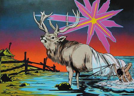 JOHN TINEY Travelling Our way studio1.1 is very pleased to present a new series of large paintings by John Tiney. Since completing his MA at Goldsmiths in 2005, where his forensic mind explored film-making, he has made a triumphant return to painting in this his first solo show. In these skewed post-pop mythologies found and re-worked images contradict themselves while their meticulous execution suggests we may be missing something. A forgotten legend, an archetype new to us. A synthesis of images bubbling from the peripheral universes of advertising and archive. Far from any fashionable dystopia, however, a new hope is to be found clinging to the wreckage in these fragments from a mutated childhood. Post-apocalyptic they may be, but after the Twilight of the Gods is the Dawn of Man, and '2001' offers some back-dated hope of survival. |