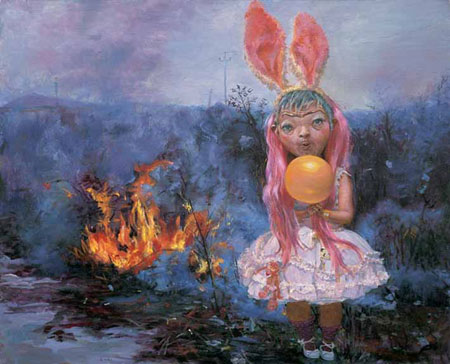 Chen Hui "Creamy Strawberry" / L/B "I'm Real" May 9 - July 12, 2009 opening: May 9, 2009, 4 p.m. - 7 p.m. All That Glitters-Visual Fool's Gold For Thought in Chen Hui's New Works A world-weary poodle-its ears tipped in punk-manqu� orange and gathered into bushy ponytails-stands in a garbage dump strewn with brightly colored commodities, perhaps the carcasses of things from our era of shameless consumptive excess. Among the refuse is a Louis Vuitton bag, a vintage perfume atomizer, a toy luxury car, various digital devices, and much more. A man with a pickaxe and a helmet skulks in the background, armed to dig for gold among the cast-off goodies, but the poodle is not interested in scrounging for a share of the loot. It looks put upon-loathing the tiny jester's crown upon its head and yearning for a respite from human foolishness-and stares resignedly at a point in space somewhere around the viewer's kneecaps. The person holding the poodle's leash is gender ambiguous. With a paunchy body slouched to one side, and a broad, head cocked to the other, he/she is a train-wreck of counter-intuitive visual signals. The corkscrew locks of his/her wig, black as squid ink fusilli, barely cover up the crew cut beneath, and yet these incongruous tresses frame that squat face with a dissonant coquettishness. Trendy yellow eye shadow highlights piggish eyes. Berry-colored lips pout above a non-existent chin. Narrow shoulders bracket a ballooning pear-shaped torso; a sad little frayed feather boa snakes down between the saggy man-breasts, while a loop of gray pearls fetchingly encircles a lopsided breast, and a gelatinous mound of belly fat undulates above diaphanous nether-garments. The visual effect of all these exaggerated details should be hideous, and yet Chen Hui has taken human imperfections-the sort we all have, like it or not - and brought out their endearing qualities rather than making them into the butt of a cruel visual joke. In an era overloaded with nauseatingly "cute" art, Chen Hui's light touch with the saccharin and cloying aspects of China's nouveau riche-inspired, urban material culture comes as a relief. With a deft hand, and the sober eye of a mask-maker who knows what our masks are meant to hide, she playfully shows our human frailty along with our vanity. In showcasing the risible futility of our attempts to fashion convincing glossy images of ourselves, Chen Hui manages to capture both the attempt and the failure to conceal what she posits as a flawed but real "true nature." She does so, moreover, in a way that eschews both the grotesque melodramatic posturing of the "cute" genre, and the hyped up "tragic drama" of more realist works that seek to illuminate human shortcomings. For Chen Hui, that we are mere plebs, laughably dressed up as celebrities parading around in piles of our own tacky garbage is no tragedy-it's just a fact of life that our contemporary pretenses are hollow and our disguises fail to fool most of the people most of the time, including ourselves, and yet she suggests that there is a poignancy in our constant resort to these devices, in spite of the ineffectual clumsiness of our efforts. With a series of new works, presented for the first time at her solo exhibition at Galerie Urs Meile, Chen Hui crafts scenes bursting with the silly and the strange, the flawed and the fabulous, the absurd and the banal, the throwaway refuse and that which can be scavenged. In doing so, she manages to reconnect images of hyperbolized popular culture, stylistic overkill and consumptive excess, with the latent humanity and sheer ordinariness of the flawed, imperfect people who populate her paintings. As a professional make-up artist, teaching her craft for the stage and set at the Communication University of China, Chen Hui is intimately familiar with the ways a surface can be manipulated to present the simulacra of the externalized selves we hope others will see. Through her paintings, and in her own explanations of her work, she posits that no matter how much make-up we cake on, which elaborate costumes we may don, or what kind of shiny trinkets we take up to signal our tastes and values to the world, we can never really escape who we are. Rather than posing as a critical unmasker, using her paintings to rip the scales from our eyes and show us the ugliness of the contemporary era in all its grotesque glory, instead Chen Hui offers a gentler sort of meditation. She lets us have our fun and poke fun at it too. She seems to understand that even as our masks are false, we need them to negotiate our place in a world dominated by polished veneers and superficial values. By making the disguises worn by these people in her latest series obvious costumes, she allows us to see both the surface and the subcutaneous at once; to see the ham-fisted attempts to adorn and embellish ourselves, in spite of the scars and the blemishes, the sag and the wrinkles, that we can never really conceal. The flamboyant wigs, the burlesque adornments, the sagging bellies, the scarred, lined and pitted skin, appear and reappear throughout this series. Yet these flaws and faux fixes are neither the object of the artist's mockery nor her pity. They are simply the testaments to the unvarnished, pedestrian realness that lurks beneath the hyperreal, gleaming surfaces of modern identity in this age of glib commercialism, and the gimcrack gaudy baubles with which we so often define ourselves. By exaggerating the exterior packaging, and squeezing her everyday characters into vaudevillesque glamorous costumes-costumes into which they never quite fit-Chen Hui lightly reminds us that all that glitters is not gold. Nevertheless, if the value of the "fool's gold" of our commodified, cosmeticized, costumed identities is its capacity help us construct the externalized selves we use to interface with the social world, then it is precisely our use of that fool's gold-those fantasies of ourselves alchemized into something 