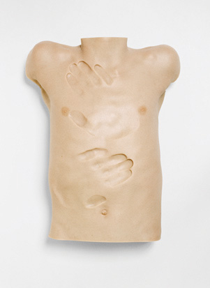 Kris�r explores interpersonal relationships and examines the complexities of the human condition by deconstructing and adulterating the figure in his sculpture and photography. His conceptually motivated work is explicitly subjective yet also focuses on universal oppositions between the self and the other existing particularly in domestic relationships. Familiar dichotomies such as mother/son, adult/child, past/present and pleasure/pain are central to his work. Investigating how past experience and memory moulds the human psyche, his works are often disarmingly direct responses to psychological distress or emotional dissent. Kris�r�s wall mounted sculptures �The birth of us� (2007) comprises of two oil painted silicon figures. Unnerving in their technical accuracy these works represent the torsos of a young boy and girl. Across the immaculately rendered surface of this work the figures bear deep gestural gouges - ambiguous indications of physicality � hands laid across the body either in violence or embrace. Notions of attraction and repulsion, distance and proximity are evident in the almost dicephalous two part sculpture �One as two (3)� 2005 which consists of two aluminum masks � one a cast of the artist and the other his mother. This largely autobiographical work represents the emotional and physical tension of this mother/son relationship. The use of strong magnets allows the cast of the artist�s face to be inextricably drawn towards that of his mother. Facing one another, the two faces are poised in mid air whilst a wire attached to the wall acts as a restraint drawing the artist away from the pull of his mother and affirming his otherness. Similarly, these dualities of distance and proximity, interior and exterior are relayed in �You Are Going Nowhere� (2007). This floor based piece consists of a child�s rucksack filled with 100kg of lead. The immovability of the work in terms of its weight and the addition of the title allude to both familial security and restriction. Recent photographs by the artist allow tangible and spectral elements to meet and exist within a pictorial space - his use of a long exposure time reducing moving figures to a mere haze of colour. These images question the relationship between the seen and the concealed, truth and hallucination.