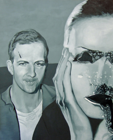 All of the paintings on display at this exhibition by Caroline Bachmann and Stefan Banz have been created exclusively for Galerie Urs Meile in Lucerne. The artists have taken images from their own private photo collection, as well as from the Internet, films, books, and magazines, and adopted, entangled and displaced political, societal and cultural motifs (both familiar and unfamiliar) to create their very own "cover versions." These new versions break free from the original images both visually and with regard to content: their significance, as well as their fields of associations change in the altered contexts. The Beatles served to inspire the artist duo to this form of usurpation, and, therefore, all of the displayed works bear the title of one of the group's well-known songs. The dimensions of the paintings at the exhibition are predominantly 52 x 63 cm / 63 x 52 cm, but four of their so-called "Large Format Bonus Paintings" are also on display, which serve to structurally define the exhibition. All of the paintings are mounted within special custom-made frame constructions, which give them the appearance of freestanding sculptures. The large-format painting Rocky Raccoon (oil on cotton, 210 x 170 cm), for instance, is mounted into a wooden box (217 x 177 x 33 cm), which could be either a transportation crate or a cabinet, but is also reminiscent of a folding altarpiece at a cathedral. When the piece is hung on the wall (opened or closed), it is just like Pandora's "box." When the cabinet is open, one painting with portraits of Lee Harvey Oswald and Greta Garbo is revealed. The injured face of Garbo is based on a small photographic work by Douglas Gordon, and the portrait of Oswald captures the very moment of his arrest, two days before he was shot by Jack Ruby. What connects these two very different personalities with each other? And what do the injuries of the protagonists have to do with the fact that the painting can be locked away? The paintings on display allow for a vast array of different meanings, which is very much comparable to our contemporary mechanisms of perception. At the same time, these works of art are marked by both conceptual and figurative homogeneity. They vehemently and explicitly, but also with a fair amount of indifference and self-deprecation call for an interpretation: the means of representation, as well as the significance and meaning of depiction in art, become the very subjects of their study. In I Am The Walrus, for instance, Mozart's skull (Mozarteum Collection, Salzburg) is attached to the body of a corpulent and lazy dog at rest. Happiness Is A Warm Gun, on the other hand, is a portrait of Petr Ginz, a victim of the Holocaust, who as a young Jewish boy at Auschwitz kept an illustrated diary. The government of the Czech Republic turned one of his drawings into a stamp in January of 2005. In Lucy In The Sky With Diamonds, a birch tree that has lost its leaves glows in the night. Sexy Sadie shows Helmut Berger (the son) and Ingrid Thulin (the mother) in an intimate scene from Luchino Visconti's film "The Damned" (1969), but the actors are unrecognizable due to the heavy backlighting. And then, in Revolution, Superman is ready to save the world, but in the background, on the roof of a skyscraper, there is a scarecrow dressed like a cowboy. In Carry That Weight, a melting iceberg swims surreally above and below the water's surface. And in Across The Universe, Darth Vader is shown giving an interview. In Working Class Hero (305 x 400 cm), Andy Warhol, wearing sunglasses and toting a sports bag, admires the Great Wall of China as a projection, an image or an actual view. And then there is Golden Slumbers, which captures a view through the peepholes in Marcel Duchamp's installation entitled "Etant donn�s: 1. La chute d�eau, 2. Le gaz d��clairage..." (1946-1966, Philadelphia Museum of Art). Caroline Bachmann and Stefan Banz reside on the shores of Lake Geneva, only three kilometers away from "Le Forestay," the waterfall that Marcel Duchamp photographed in 1946, and which became a point of departure for his last great work. In the center of the large exhibition hall in Lucerne stands last but not least Here Comes The Sun, a monumental sculpture of a tone-arm that has a paintbrush instead of a gramophone pick-up. Its unusual realization and oversized status (150 x 750 x 210 cm) make it an abstract and surreal figure. A full-color 48-page publication the size of a CD case accompanies the exhibition. It includes 38 images of all the paintings on display, as well as an essay written by the artists on their work. It was published by the Galerie Urs Meile in 2007. Translation: Gunilla Zedigh |