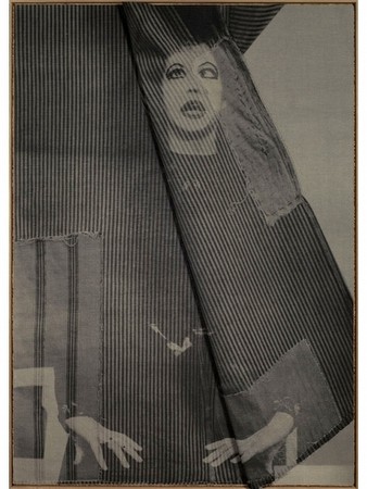 Noonan’s choice of boro and his casting of actors determine one another. Different cultures from different decades define and compose one another. The edge of a stage or the profile of a face or a body and a rough tear in a piece of cloth loose their scale and work together to deliniate the ‘Divine Proportions’ of the pictorial surface. Elsewhere the hands of performers appear to be in the process of constructing their own image as they seem to pull threads together and fold in a further layer fabric. A couple shelter under a tree appearing to be both under canvas and imprinted onto it. And a pair of performers press one another and their surface firmly into place.