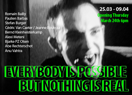 Time To Meet presents: EVERYBODY IS POSSIBLE BUT NOTHING IS REAL OPENING MARCH 24TH 6PM Exhibition open March 25th � April 9th Romain Bailly Paulien Barbas Stefan Burger C�dric Van Caeter / Jeanne Boukraa Bernd Kleinheisterkamp Alexi Meteni Bjarke PZ Olsen Abe Rechterschot Anu Vahtra The artist's job is to build the world of tomorrow. The strategies are contradictory. Some are suggesting forms, images, ideas, while others are busy deconstructing them, pointing behind the curtain. EN Artists build the world of tomorrow! The Brussels gallery Aeroplastics hosts in its upcoming exhibition 10 international artists presenting contradictory strategies in contemporary photography, video and painting. Some are creating forms, images and ideas, while others are busy deconstructing them, analyzing structures and processes, pointing behind the curtain. Building up and tearing down, construction and deconstruction are the major key-words within the chaotic variety of artistic strategies in the context of EVERYBODY IS POSSIBLE BUT NOTHING IS REAL. No matter if one is looking for meaning or unveiling its falsity, both actions are ro-mantic in the attempt to obtain some kind of reality. The utopian gesture of pointing at brightness and claiming it's the light. According to the title, inconsistency beats exclusivity when it comes to describing the world. Nevertheless, any conclusion is possible, one just needs to decide where to be positioned. FR Les artistes construisent le monde de demain! La galerie bruxelloise Aeroplastics invite pour sa prochaine exposition 10 artistes internationaux qui rassemblent des notions contradictoires en photographie, video et peinture. Certains cr�ent des formes, images et id�-es, d'autres les d�construisent, par l'analyse des structures et des proc�d�s, en d�voilant leur antichambre. Construire et d�faire, constituer comme suspendre sont autant de strat�gies artistiques qui �tayent EVERYBODY IS POSSIBLE BUT NOTHING IS REAL. Qu'il s'agisse de don-ner un sens ou d'en d�masquer sa vanit�, l'acte sous-jacent est romantique dans sa tentative d'obtenir une r�alit�. C'est le geste utopique de pointer une �claircie et de pr�tendre au soleil. Selon le titre, l'incoh�rence s'impose quand on en vient � d�crire le monde. N�anmoins, toute conclusion reste possible, � chacun de prendre la place qui lui convient. NL Kunstenaars bouwen de wereld van morgen! De Brusselse galerie Aeroplastics brengt in haar komende tentoonstelling 10 internationale artiesten samen die tegen-gestelde standpunten in hedendaagse fotografie, video en schilderkunst voor-stellen. De ene kunstenaar cre�ert vormen, beel-den en idee�n, terwijl de ander deconst-rueert door het analyseren van structuren en processen, het onthullen van wat zich achter het gordijn afspeelt. Opbouwen en afbreken, constructie en deconstructie zijn de belangrijke trefwoorden binnen de chaos aan uiteenlopende artistieke stra-tegie�n in de tentoonstelling EVERYBODY IS POSSIBLE BUT NOTHING IS REAL. Het is van weinig belang of men zoekt naar betekenis of dat men zich er juist van wil ontdoen, beide acties zijn romantisch in hun poging een zekere realiteit te vinden. Het utopische gebaar van klaarheid scheppen wanneer men het licht heeft ontdekt. Zoals weerspiegeld in de titel overwint inconsistentie van exclusiviteit wanneer men de wereld wil beschrijven. Desal-niettemin is elke conclusie mogelijk en moet de toeschouwer zelf uitmaken waar hij zich kan positioneren. ROMAIN BAILLY (FR/BE) I would like to be able to build something, but I haven't got enough interest in the finished product, in fact my work is not what it is, but what it tells. It means that the wheels I've made (I, II, III, IV) are not wheels but the circle, the endless beginning; the portrait does not represent people but the gaze, the one of fear, of hope and of sadness; Igreja is not a church but the envy of a church. I think that we can't build anything, but we are searching, and this investigation may only happen through the literary, plastic or philosophical image. PAULIEN BARBAS (NL) What I want to show is the image itself. Not as a transparent medium that shows the world, but as a medium that renders reality in a specific way. The limits of photography are distorting and defamiliarizing my images and make them balance between something familiar and something new. Using existing images and works of art gives me the possibility to apply the medium for what is has been originally invented: the documentation of what�s already there, with all its restrictions and possibilities. STEFAN BURGER (DE/CH) (based in Zurich) explores the medium of photography, creating fragile installations that extend into theatre-like mis-en-sc�ne. In recent years Stefan Burger has expanded his use of photography into wallpapers and installations, and he has taken on new media such as 16mm film and even performance-based work. Photography is often no longer recognizable as the initial point of departure. Burger�s work is a wistful investigation of production and consumption in the system of art. At the core of the artist�s work is a preoccupation with art history and theories from the academic canon, which he references and negotiates with sharp, profound, and humorous gestures that frequently shed light on the systemic principles underlying production and consumption. Stefan Burger�s gaze often also turns from these art historical and theoretical manifestations to his own role as an artist and examines the expectations of and pressures on the protagonists operating in this field. Toying with a kind of detachment or ambivalence in the artists� role as producer, and touching on existential themes such as the fear of collapse or definitions of value and validity, the artist gene-rates pointed remarks with wit and incisiveness. (Freymond-Guth Fine Arts, Zurich) C�DRIC VAN CAETER (BE) For the last couple of years I have travelled in Europe