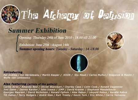Summer Exhibition "The Alchemy of Delusion" by Terry Rodgers Opening: Thursday 24th of June 2010 - 18.00 till 21.00 Exhibition: June 25th - August 14th Summer opening hours: Tuesday - Saturday : 14 -18.00 Introducing Pat ANDREA, Ion B�RL�DEANU, Martin KASPER, KOOR, Stu MEAD, Carlos MU�OZ, STEPANEK & MASLIN, Wolfe von LENKIEWICZ Artists of the gallery Carlos AIRES, Amanda BESL, Olivier BLANCKART, Charley CASE, Colin COOK, Ronald DAGONNIER, Jimi DAMS, John ISAACS, JIMP, Dennis KARDON, David KRAMER, Stephane MANDELBAUM, Georges MEURANT, David NICHOLSON, Ronald OPHUIS, Alex RABUS, L�opold RABUS, Renate RABUS, Till RABUS, Terry RODGERS, Andr� STAS, Kurt TREEBY, Gavin TURK, Eric WHITE, Carrie YAMAOKA |