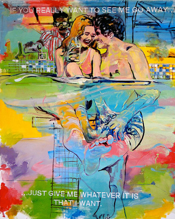 DAVID KRAMER � If you really want to see me go away� just give me whatever it is that I want � As the title of his exhibition at Aeroplastics Contemporary makes abundantly clear, one doesn�t get rid of David Kramer that easily. Give him what he wants? Okay, but just what is that? The little phrases with which he sprinkles his drawings and paintings are always in the first person, and denote a form of permanent dissatisfaction. The sort that leads not to depression, no, but rather to a good sitdown with a glass of whiskey (a libation that occupies no small part of his oeuvre). Expressions of the artist�s chronic dissatisfaction, something that Kramer himself pokes fun at in his videos? Or the inability of the American Way of Life � whose clich�s furnish the basis of his iconography � to make us happy? After all, we are all artists... As Michel Butor recalls in Les mots dans la peinture: �..in bygone days it was said that poets painted with words�. And indeed David Kramer, after his training as painter and sculptor, cultivated a close interest in poetry. Words ended up inextricably integrating themselves within his graphic oeuvre, to the point of creating a sort of hybrid, mid-way between the plastic arts and literature. Narrative is in question here, when he incorporates typed text with his images, with disillusion and irony ever at the fore. An extract: �You know, if I could just go back and have some of the money back that I blew on beer and cigarettes over the years, I�d probably be a millionaire. Man, I wish I hadn�t been so wasteful. But you know, if I could somehow get all of that money back, I�d just go and blow it all over again.� The full text is centered on money matters, and to illustrate this (or contrarily, is the text doing the illustrating), Kramer furnishes the simple portrait of a young couple, seemingly drawn from a 70�s cigarette ad (she�s smoking, he�s standing back). Another text, handwritten, frames the image: "If I could go back and change a few things, I would... But I am not sure if the things I aspire for ever really existed, anyway." The rapport between the two texts is clear, while that between text and image is less so. Cigarettes? But what about the beers... Other works introduce a more direct relationship between word and picture: a lit cigarette burning in an ashtray, with the text proclaiming that all the cigarettes smoked by the artist, if put end-to-end, would cover the distance of a marathon. The work of David Kramer is not reducible to a system, and it�s just this that makes it interesting. Everything functions as though the text-image relationship obeys a logic, but then each time different. When he writes: "I am still hopeful that one of these days I will finally get this thing off the ground," above a Pan-Am Boeing, it�s more than likely he�s making reference to his own career as artist, and not to any hypothetical flight-deck ambitions, as the rest of the text goes to show: "... I just hope when that finally does happen, I get more than a bag of peanuts." In another vein, the many and various bottles of Jack Daniels and Jim Beam that he�s painted, are each time accompanied by a different text, but all evoke different existential states allied to the (somewhat) abusive consumption of alcohol: �Stop me if you�ve heard this one before�, �Plan B�, �Stop me if this is starting to sound familiar�, �No more Mr. Nice Guy�, etc. In the description of his philosophy of life, David Kramer�s favorite conjunction is the word �but�: things could be better, but they are what they are; or, things might change, but does that mean for the better? Ironic, bittersweet, inhabited by a New York-Jewish sense of humor, the work of David Kramer uses text and image to bring us those little (self) reflections that flash through all our heads at one moment or other during the course of the day. His illustrations, harking back to stereotypes peddled by ad agencies during the golden 60�s and 70�s (less golden, but anyway..), make us consider to what point the notion of happiness, as soon as it�s used to sell a product, a concept or a style, becomes relative. And despite his assertion that �... In a perfect world, I would be one happy mother fucker,� he will forgive us if we continue to have our doubts. Pierre-Yves DESAIVE |