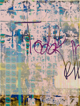 TODD KELLY Signature Paintings May 12 - June 18, 2011 Opening Reception: Thursday May 12, 6-8pm Asya Geisberg Gallery is pleased to announce "Signature Paintings," an exhibition by New-York based artist Todd Kelly. In his new series, Kelly uses his name as a springboard for painterly experimentation. Kelly manipulates the letters as a compositional structure, sometimes as an exaggerated logo, a half-buried talisman, or altered beyond recognition. Inspired by a non-hierarchical approach to art history and diverse sources such as architecture, graffiti, and graphic design, Kelly takes the viewer on a journey through modes of abstraction, engaging painting as physical and philosophical space. In his paintings, Kelly provokes us to ponder the creative mechanism behind his work. Layers of brushwork, drips, spray paint, stencil, and collaged elements culminate with a surface of parallel dotted lines. Sometimes, large areas of paint cover the painstakingly-applied marks, in a victory of expressionism over control. The delicate uniform marks form a pattern within the picture plane, and are a second form of "signature." In Scrim Painting I, a zigzag of diagonal lines covers all but the top edge of the painting. Made of finely nuanced gradients of pinks, the pattern is a geometric extension of the veil. But while the veil both covers and beckons with its seduction by suggestion, the lines also call to mind a hard-edged grated fence. Beneath are lush jabs of paint, insouciant dots of spray paint, and washes of color. Buried deepest is the negative space of the artist's initials - a whisper compared to the manic activity on top. Ultimately, as the signature of the artist becomes a faint echo, the ego is effectively erased. In Untitled (Leaves), actual leaves have been adhered to the canvas, as if to point out the old saw about seeing the forest for the trees. On top of the precise fine lines is a splotchy pink layer - as if a drunken rock star had lost control in an elegant hotel room. Untitled (Leaves) is what we see midway through the crash and burn - the starched linens unfurling, the sconces still intact, the ashtray spilled. The hours of careful work required to complete lines of equal length and distance, with quasi-scientific concern for color, compete with a Dionysian expression of id. As Kelly remarks, "the eye switches back and forth between illusions deciding which to land on." Originally from Michigan, Todd Kelly studied architecture, before taking up painting as a career. He earned an MFA in 2000 at the School of Visual Arts and a B.A. in painting at Anderson University, IN. Kelly lived in London from 2003 to 2006, where his work was featured in the 2006 Jerwood Painters Exhibition as well as many group exhibitions. In 2010, his work was featured in "Crowd Scene," an Artforum Critic's Pick. Kelly lives and works in Brooklyn, NY. Asya Geisberg Gallery 537B West 23rd Street New York, NY 10011 (212) 675-7525 [email protected] www.asyageisberggallery.com Gallery Hours are Tuesday - Saturday, 11 - 6. |