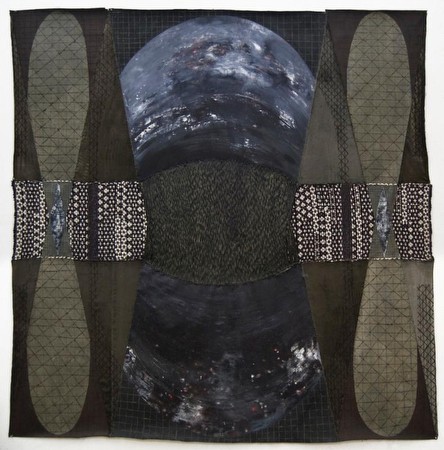 Oil, linen, wool and silk yarns, velvet, 86" x 85" |