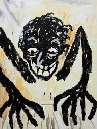 Ricardo Gonzalez: "Rot Open in Bliss" December 11, 2014 - January 31, 2015 Opening Reception: Thursday, December 11, 6 - 8 pm Asya Geisberg Gallery is pleased to present "Rot Open in Bliss," an exhibition of paintings by Ricardo Gonzalez. This will be the artist's first solo exhibition at the gallery. Gonzalez employs a virtually monochromatic palette and simplified gestures to explore the language of abstract painting. Mutinous, tarry figures bearing grimaces and smirks intermittently disrupt the series' more unfettered compositions, which at times suggest both rudimentary aspects of a figure, and remnants of cultural iconography. "Smile" for example could be the profile of Caesar, while "Phone Minimal" recalls a laughing Ronald McDonald. While creamy grounds contrast lustrous black daubs, brazen error disrupts fugitive imagery, further exposing the idiosyncrasies of the artist's hand and our desire to form a figure. A symbiotic duality exists within the series, as the artist ricochets between the sublime and the nihilistic, creating a tacit dialogue between satirical cartoon and evocative painterly gesture. Skateboard graphics and the Neue Wilde painters of 1980's Germany are notable inspirations, whilst inky black figures with popping eyes and uninhabitable bodies - offspring of Sergio Aragone's MAD cartoons and Gonzalez's own schoolbook doodles - populate the artist's own Wilden Szene. The painting "Rot Open in Bliss," a title taken from Anthony Burgess' novella "A Clockwork Orange," depicts a deranged, bodiless figure with arachnid arms in the midst of creative rhapsody. Synonymous with Lacan's jouissance, Gonzalez's character transcends enjoyment, to straddle the boundary between ecstasy and violence. The essence of jouissance saturates Gonzalez's cartoonish figures; their implausible physiques with misshapen limbs suggest a crescendo of pleasure on the brink of savagery. Painted to the sounds of Beethoven, Gonzalez's frenzied pianist exemplifies the emotional tipping point. His smile, contorted with pleasure, tips over into a grimace. His eyes bulge whilst hands thrust at the keys, leaving us to only imagine the symphony, a sentiment Burgess himself depicted: "Oh, bliss, bliss and heaven. I lay all nagoy to the ceiling, my gulliver on my rookers on the pillow, glazzies closed, rot open in bliss, slooshying the sluice of lovely sounds." Error and chance continue to charge more minimal works, where the artist retreats back into the medium, creating grand imagery with restrained line. The artist utilizes the most minimal gesture to articulate a milieu in "Two Laughing;" a mixture of fluid line and solid black pools deftly conjures a conversing couple motioning toward something humorous outside the picture plane. The most direct reference to the doodled page comes via "Sleep," where a quirky head floats within an impatiently sketched dreamscape of limbs, a fragmented face, and an imperceptible scribble reminiscent of the iconic Arby's hat. Gonzalez elevates seemingly cursory doodles from their predictable banality, as subconscious "automatic" drawing amasses significance, transcending into objects of art, and becoming signifiers of pure form, medium, and process. Ricardo Gonzalez was born in Mexico City and lives and works in New York. He received an MFA from New York University, and his BFA at New England School of Art & Design, Boston, MA and Madrid, Spain. He has exhibited in numerous venues in New York, NY, Boston, MA, Miami, FL, Berlin, Mexico, and Belgium. Recent exhibitions include UNTITLED. Miami, Galeria Talcual, Mexico City, Traneudstillingen, Copengahen, Denmark, and Galeria W, Santiago, Chile. He is a recipient of the Martin Wong Scholarship Award in Painting. |
