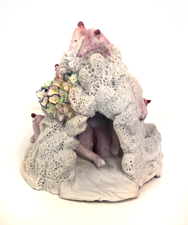 ANNIE ATTRIDGE HEARTS OF OAK January 15 - February 12, 2011 Asya Geisberg Gallery is pleased to present �Hearts of Oak�, an exhibition of porcelain works, bronze sculpture, and charcoal drawings by British artist Annie Attridge. Attridge creates a universe of caves, mounds, entrances into flesh and exits into limbs, breasts, and flowery decadence. Her bawdy and sometimes brazen imagery explicitly contradicts the decorum of traditional porcelains, revealing what hides beneath a petticoat. The rococo curving lines of 18th century porcelain are evoked in arms and legs entwining, tree limbs twisting, and animal and figure amalgamations. In the intimacy and luminous delicacy within her pieces, Attridge expresses a torrent of emotion. Attridge�s lush drawings create a velvety cover of compressed charcoal, adding drama to her cavorting carnality. Her bronze works emasculate while simultaneously endowing a symbol of timelessness and strength to soft bodies and billowing sails. The process of making porcelain is long and difficult, but Attridge�s playful pinched pieces exude a simplicity and ease. Similarly, in her bronze works, Attridge takes a complex and arduous process with a long history, and shrinks the patently megalomaniacal into toy-like scale. With Flogging a Dead Horse, instead of a super-sized statue of a general on his horse proclaiming victory in the public plaza, Attridge gives us a truly miniature pony, with a shiny breast for a hump. In Termite Boobie, Attridge takes gargantuan cathedral mounds where termites create a self-contained world of digestion, and turns them into another kind of symbol of nourishment. In Love on the Rocks, the termite mound, a colony for millions, has become a private cave for half-submerged lovers. The title of the exhibition, �Hearts of Oak�, is a Cockney expression, which in the rhyming slang of working-class British culture means �broke�. A sly nod to the traditional penury associated with artists, it is also a witty joke on the upper-class origin of the decorative figurines that sit atop mantelpieces. In Attridge�s works, traditional British aristocratic referents -- the hunt, the private garden, and gymkhana equestrian events-- are fused with private dramas of desire and longing. In the churning of art history, Roman mythology and Chinese technology are repackaged by 17th century workshops led by Meissen and Sevres, then later copied by centuries of English hands, and finally a modern lass discovers a neglected art, and finds new stories to tell with this privileged medium. As Attridge says, �I have a love relationship with porcelain, and I hope we never fall out.� In Your borders, your rivers, your tiny villages, multiple figures prance within a maze of hedges, all on a scratched old ping-pong table. Metaphors multiply, as the landscape of the body is conflated with the arenas of play, sport, and games. Behind the charm and gaiety lies a melancholic air, where true happiness is just out of reach, and the potential for romantic fulfilment might never be realized. Born in 1975, Annie Attridge lives and works in London. With a MA from the Royal Academy, and BA in Painting from the University of Brighton, Attridge was featured in �Grand National - Art from Great Britain� at the Vestfossen Kunstlaboratorium, Norway, and has had exhibitions at Galerie Maurer, Frankfurt, and Nettie Horn, London. She will be in �Material Worlds� at the Contemporary Art Society, and �Belle Laide� at Danielle Arnaud Gallery, both in London. This will be the artist�s first solo exhibition in New York. |