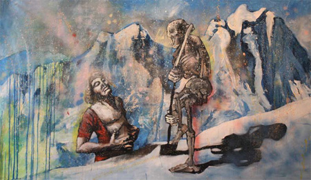 Eat when you can Sleep when you can 10th of January-8th of March 2011 Philip M�ller's first international solo exhibition. Carbon 12 proudly presents the first international solo exhibition of Philip M�ller. With overflowing energy and impressive technique, his paintings are a wild ride: with subjects from pop culture icons to belles-de-nuits, Icelandic shamans, and the Adams Family, M�ller creates a symbolist universe where everything, anything, could and will happen. Dionysus meets Jesus, cannibal monkeys on LSD, the content is as radical as the style: painted with finger on linoleum floor, poured all-over-style, masterly brush technique combined with excessive speed. The canvas becomes a battlefield of chance and composition, assemblage and association. Like alchemy, M�ller's paintings can be seen as ecstatic rituals, a dialogue with the spirits, and cathartic acts that unleash primary forces. The paintings develop a life of their own, the portraits begin to speak, the scenes evolve: a constant flux is felt, as if the canvas is shivering and vibrating. The works preserve the traces of the strong Theatrical/performative presence: the playful approach to the material itself transform his oeuvre into documents, historic artifacts from parallel universes, imagined ages, trippy flashbacks. But M�ller's creative explosions go far beyond the medium of painting, and there will be a special performance by the artist and special guests on the opening night. So there is really no excuse to miss this groundbreaking exhibition, because like the title says: eat when you can, sleep when you can; but life never takes a break. |