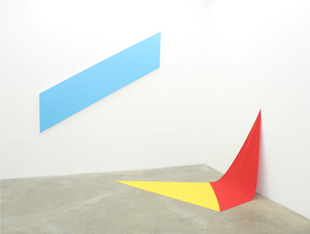 Hugo Pernet & Hugo Sch�wer-Boss Kid Nation Vernissage le samedi 24 mai de 17h � 21h Opening on Saturday May 24th, 5-9pm Exposition jusqu'au 18 juin 2008 du mardi au samedi de 11h � 19h Exhibition runs through June 18th, 2008 Tuesday-Saturday, 11am-7pm Communiqu� de presse, texte de Jill Gasparina Kid Nation est un programme de t�l�-r�alit� am�ricain, lanc� en 2007, dans lequel des enfants rejouent la vie des pionniers, dans les ruines de la ville de Bonanza au Nouveau Mexique. L'�mission a fait scandale, parce que les enfants se blessent, avalent du chlore par erreur, et qu'ils doivent travailler : il n'est pas facile de cr�er une soci�t� autonome de toutes pi�ces. Si Hugo Pernet et Hugo Sch�wer-Boss ont choisi Kid Nation comme titre pour leur exposition, c'est parce qu'ils rejouent eux aussi une histoire - celle de l'abstraction - qu'ils s'approprient avec une extr�me facilit� et selon des modalit�s toujours changeantes, qu'il s'agisse de la pure inversion (N�gatif), du d�tournement �l�gant, de la simple allusion (Souvenir, Ellsworth Kelly, � yellow red curve �, 1972), ou de la blague, avec Plan B qui reprend les A d'Olivier Mosset. Ils sont � l'aise : ils ont assimil� toutes les conclusions que les g�n�rations successives de peintres abstraits ont tir�es de leurs pratiques. La peinture est morte. Elle est injustifiable. Elle est d�corative. Et l'abstraction pure n'existe pas, parce qu'elle est toujours en situation, parfaitement int�gr�e d�sormais � la vie quotidienne : elle a bascul� dans l'imagerie. Ainsi la peinture Blue Crush tire-t-elle sa forme des affiches publicitaires pr�sentes dans les rampes d'escalier de m�tro. D�tail est issu du graphisme des mannequins de crash test. Adidas (OM) reprend les c�l�bres trois bandes et la couleur de l'ancien maillot de l'Olympique de Marseille. Et les peintures color�es de High School (Lockers) sont plus proches de l'univers d'Elephant de Gus Van Sant que de celui de Frank Stella. Et apr�s ? Comment faire une abstraction de kids alors que le modernisme a �t� revisit� jusqu'� l'overdose et que l'histoire est �crasante ? Ne peut-on que jouer � �tre des pionniers ? Comment peindre sans d�f�rence ni nostalgie ? Yve-Alain Bois proposa une r�ponse possible - un m�lange de dr�lerie et d'aust�rit� - lorsqu'il �crivit qu'il faudrait �tre capable de regarder Full Fathom Five de Jackson Pollock comme un oeuf au plat, tout en d�clarant s�rieusement vouloir � faire en sorte que l'unit� du modernisme telle qu'elle a �t� constitu�e par l'opposition du formalisme et de l'iconologie soit cribl�e de part en part � . Les oeuvres d'Hugo Pernet et Hugo Sch�wer-Boss ont aujourd'hui moins � voir avec l'esprit de s�rieux, ce corrolaire habituel de toutes les r��critures pieuses du modernisme, qu'avec un m�lange de ce type, une gaiet� extraordinaire et color�e (des jouets) et une radicalit� qui n'est pas sans violence. Une image hantait d'ailleurs les deux artistes lorsqu'ils ont pens� � ce titre, Kid Nation, un r�cit fictif, un fantasme ballardien et destructeur, des enfants qui jouent dans les ruines du MOMA et qui s'emparent sans g�ne des formes qu'ils ont sous les yeux, des sales gosses. Hugo Pernet est n� en 1983 � Paris ; il vit et travaille � Lyon. Hugo Sch�wer-Boss est n� en 1981 � Poitiers ; il vit et travaille � Besan�on. |