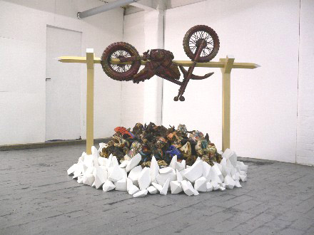 LONERS' ISLAND Gordon Robin Brown, Lloyd Durling, David Marchant, Alex Gene Morrison, Dan Mort, Miranda Whall Curated by Mermaid and Monster Accompanying text by Leona Jones Preview: Friday 23rd November 6.30-9pm Open Wed to Sat 11-5.30 until 12/01/08 NB Closed between 16/12/07 and 03/01/08 Loners' Island is a place familiar to many artists and audiences. It is a place of melancholy, danger, wonderment and disinterested curiosity. It is full of discovery, boredom and potential pitfalls, an aesthetic and conceptual island where both spectator and creator is dragged between extremes of naivet�, mean-spirited sophistication, calculated ugliness, the sublime and the ridiculous. Gordon Robin Brown makes satirical and surreal paintings which combine a curious mix of elegance, humour and eroticism. The works pose bizarre narrative scenes depicting a strange, compromised paradise where both human and animal characters are set in private folkloric ensembles against vast expanses of colour. The large-scale acrylic paintings and small ink watercolours are drawn with a clarity of line and refined draughtsmanship; ideas come through doodling and sketching, often drawn directly onto canvas with no predetermined plan. Brown works instinctively, responding to ideas as they suggest themselves as he works. In one painting, it seems as though the world of Beatrix Potter has collided with The Joy of Sex. Lloyd Durling's delicate and minutely detailed biro drawings explore the way in which many artists are currently dealing with the meaning of landscape. The fantasy elements of his work, their magical extravagancies and gestural filigrees are juxtaposed with brutalised visions of humanity and environmental destruction. The complexity of these works offers a poised view of a world that is simultaneously perfected by technology and destroyed by modern warfare and industry. David Marchant�s work embraces technology and also questions it. He uses simple, recognisable objects reworked to engage with complex issues. He also uses video and performance to question identity and challenge possible public oppression. Known for his slick and slimy pictures of mutant creatures, Alex Gene Morrison lures his audience into a world of melting heads, rotten carcasses and giant flies. The idea of seduction and repulsion is very important to Morrison. His paintings, collages and animations brings the audience into a visceral experience and then keys into some of the base, yet very powerful human emotions such as desire, fear, disgust and wonder. Dan Mort describes his work as �possible sculpture�. Playfully fusing disparate items, materials and modes of production, his pieces often reference familiar modernist strategies that are thrown off balance by the inclusion of unexplained elements. sheer materiality and a sense of the arbitrary play against the works� potential as signifiers. He wants to consider whether determined conditions of viewing inevitably force the assignation of contextual or symbolic resonance, or if the resulting work could in fact be understood as nothing more than stuff, arranged �sculpture-wise� in vacuous, quasi aesthetic configurations. Miranda Whall's videos, photographs and drawings create unique contexts in which to represent specific relationships between herself, nature and the wider external environment. Self-portraits absorbed in the scatological necessities, autoerotic pleasures and the pragmatic monitoring of her fertile conditions are played out and coexist alongside arbitrary and seemingly indiscriminate non-hierarchical groupings of images and objects such as birds, farm machinery, rural architecture and transport. Whall, often humorously, attempts to establish an equality between herself and her co-habitors or locality. She is interested in purposefully ignoring the boundaries that exist between her and other things and through doing so questions what and where it is appropriate and inappropriate to be female. If Loners' Island has more than one resident, then surely it becomes a small community of likeminded souls with connections between the artist and audience. Not so on this desolate, rather disturbing isle, where each artist would rather die a honourable death or eat his or her young than become part of the general consensus. Each artist here stakes their own idiosyncratic claim on Loners' Island, where their work can fight internal battles and say, This is this, this isn�t something else. |