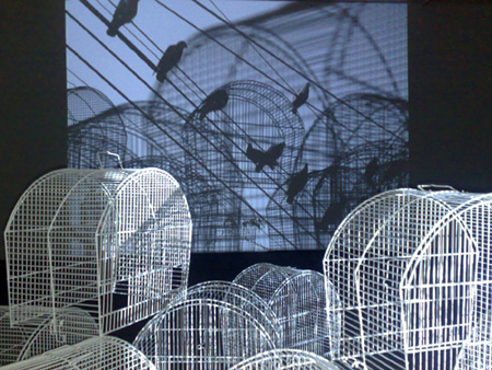 "Call Waiting", 2006 Video installation with 16 bird cages |