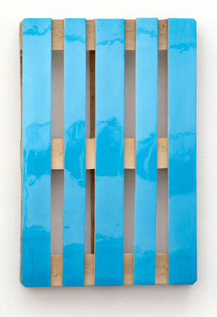 EUROPALLE m.m. By showing the group exhibition EUROPALLE m.m. (EUR PALLET etc.) Galleri Tom Christoffersen presents a wide variety of very cogent works of art. Ib Geertsen submits new and old mobiles (1953-2008), Bodil Nielsen selects paintings from her series Pacific (2005), Elmer chooses a few of his painted images with a subject matter which departs from licorice allsorts (1982) and Honza brings refined EUR Pallets. The mobiles by IB GEERTSEN are titled �Drawing in Air� or simply �Movement�. They are pieces of Danish Konkret Kunst - concrete sculptures resembling three dimensional and dynamic drawings, which moves in space in what resembles a long and balanced infinity. For several decades Ib Geertsen has gained respect for his concrete painting and sculpture and the mobiles have been an important part of his production since 1950. BODIL NIELSEN has a formal approach to painting. The series �Pacific� is from the part of Nielsen�s production, which is pure matter of fact. The series is completely freed from compromising transparency, soft edges or ambiguous layers. Instead �Pacific� comes forth as vertical large scale and narrow formats carrying broad horizontal coloured planes which is juxtaposed on the same surface and stretches uninterrupted from one edge of the canvas to the other. The pieces by ELMER resemble formal painting but basically represent licorice allsorts in two dimensions. The single abstracted piece of candy is flattened and blown up in order to simply and uncompromisingly fill up a whole board or canvas. In these conceptual works it is the line, the colour, the form � and the recognition, which makes up a meaning. The group of works are from the beginning of the 1980ties a period where Elmer formulated POST-PAINTING as notion and praxis: To repeat � copy the world from mass culture in which the unique was unthinkable. HONZA departs from an every day object as well: The EUR pallet. A European standardised product, which is reworked by the artist to become a piece of art. The front of the pallet is polished and given lacquer to the point where it carries some of the same features of formal sculpture. They work both mounted on the wall, leaned against the wall and put on the floor, from where they touches reality and plunges into art history�s web of established meanings. P� gruppeudstillingen EUROPALLE m.m. inviterer Galleri Tom Christoffersen til et bredt udvalg af stramme v�rker. Ib Geertsen pr�senterer nye og �ldre mobiler (1953-2008), Bodil Nielsen enkelte malerier fra serien "Pacific" (2005), Elmer et udvalg af malede billeder med motivisk afs�t i lakridskonfekter (1982) og Honza stiller med bearbejdede europaller (2008). IB GEERTSEN mobiler b�rer titler som: "Tegninger i luft" og "Bev�gelse". Det er abstrakte drejeskulpturer, der som tredimensionelle, dynamiske tegninger bev�ger sig i rummet i en lang og afbalanceret uendelighed. Ib Geertsens konkrete malerier og skulpturer har l�nge v�ret anerkendt, og mobiler har v�ret en vigtig del af kunstnerens produktion siden 1950. Der er mange m�der at arbejde konkret p�. BODIL NIELSENs serie "Pacific" er fra det spor af kunstnerens produktion, der er benh�rdt. Pacific er fuldst�ndig blottet for formildende transparens, bl�de konturer eller tvetydige overlap. I stedet st�r de smalle vertikale formater kompromisl�st frem og lader brede horisontale farvefelter g� fra kant til kant. ELMERs v�rker ligner formelt maleri men gengiver lakridskonfekter i to dimensioner. Det enkelte stykke slik er konsekvent gjort stort og fladt, s� det simpelt, k�ligt og effektfuldt fylder et helt v�rk ud. I disse konceptuelle v�rker ligger meget i stregen, farven, formen - og i genkendeligheden. V�rkerne er fra starten af firserne, fra den periode hvor Elmer formulerede POST-PAINTING som begreb og praksis: At gentage - kopiere verden fra en massekultur, hvor det unikke er ut�nkeligt. HONZAs afs�t er ogs� i et dagligdagsobjekt - Europallen. Et funktionelt objekt der er raffineret til v�rk, da fronten er slebet og lakeret s� pallen til forveksling ligner konkret skulptur. De fungerer b�de oph�ngt p� v�ggen, l�net op ad v�ggen og lagt p� gulvet, hvor de tr�kker tr�de ud i virkeligheden og ind i kunsthistoriens net af etablerede betydninger. ANNE SOFIE BIRD M�LLERs CUBE-udstilling (Desert Music) er forl�nget frem til 23.08.2008 |