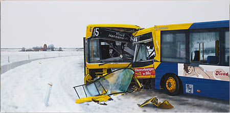 STILLE BILLEDER (SILENT PICTURES) �In Otte�s figurative universe the conventional values have been turned upside down. Aspects of reality that are often given a lower priority are emphasized and consequently, at long last, they find their way to our desirable gaze�.* Galleri Tom Christoffersen presents Allan Otte�s solo exhibition �Stille billeder� (Silent Pictures). The paintings show human influenced but completely deserted provincial landscapes, which are in a paradoxical state of immediate established and infinite standstill. The large horizontal pieces appear clearly as figurative painting but dissolve into controlled and abstract strokes of paint when examined up close. Wrecked cars and overturned trucks in an abandoned landscape is the recurrent motive of the new paintings by Allan Otte. But destruction as such is not the primary subject matter. The accident operates as a particular way of telling a story, as the crash stops the movement of the car and forces us to strand somewhere in the middle of nowhere where a hold would have been unthinkable for most. Instead of showing the dramatically period before the accident or the violent moment, where the landscape is actually influenced by the disaster as it happens, Allan Otte decides to point at the infinite time after the accident. The silent paintings consist of a particular duration, which is put forth and given value. It is about a state of stagnation cleansed from changes or influences, which most of all resembles a hesitating calm after the storm. The �realism�, which at a distance communicates the narratives, is dissolved in many ways. Concretely speaking the overall motive is broken down to painted surface, when looked upon at close. A plane, which consists of diffuse spray painted areas tightly kept at ease as they border innumerable sections, where the disciplined strokes of paint are either horizontal or vertical. When it comes to the landscape, which in the illusion of painting is recognized as the contemporary Danish province, the actual places does not exist �out there� as the sketch for each painting is sampled digitally by an immense amount of image fragments downloaded from the world wide web. In the works of art by Allan Otte an explicit union of figurative painting and an exploration of painting as media is to be found. By his systematically approach to painting as an independent research and his at the same time insisting on both narrative, subject matter and illusion Otte seems to master both investigating abstract painting and �realism� in one. Allan Otte (1978) graduated from the Royal Danish academy of fine Arts in 2007. He is nominated to the Carnegie Art Award 2008 and therefore participates in the exhibition shown in estimated European Art Museum until April 2009. Of previous and upcoming exhibitions the following can be mentioned: the solo show �Everything is Good Here�, Galleri Tom Christoffersen and Himmerlands Kunstmuseum (2006). �Go Figure�, Arken Museum for Moderne Kunst (2006), the solo show �Landscape Painting� Skive Kunstmuseum (2008). �Enter� (triennale), Kunsthallen Brandts (26.10.08-11.01.09). �Gr�nningen�, Bornholms Kunstmuseum (01.11.08-18.01.09). In 2004 Allan Otte became represented at Arken Museum of Modern Art with two paintings and at Skive Kunstmuseum in 2006 also with two works of art. *The quote is from �Glimpses of Reality and Picturesque Moments� by Rasmus Vestergaard in catalogue �Landscape Painting�, Skive Kunstmuseum 2008. |