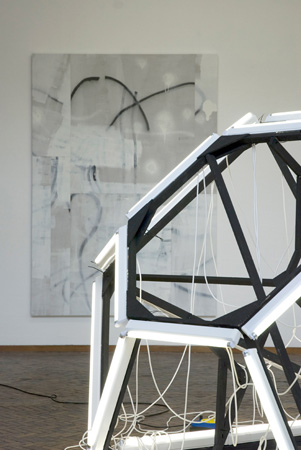 CAN'T The exhibition CAN�T presents 5 abstract/conceptual positions within contemporary art. 5 young artists give their personal interpretation of the history, and possible future, of art. Can't is open, not empty, It has a kind of negativity that is pretty easy to break. It gives you the energy to do something, just because you can't or it's impossible: "You can't do that", "No I'm not." Can't is the opposite of what Science or Art should be. Its raises questions like: Can't do what? Or, the exhibited works were impossible? Banned from the Garden of Eden? I don't know. I hope so. While still at the Academie voor Beeldende Vorming, the work of Koen Delaere (1970 Bruges) stood out for its bold and energetic commitment to reinventing the entire discipline of painting. His principal themes are growth, excrescence and change. Delaere�s paintings and drawings come into being through a process of constant growth and change until reaching the magic moment of completion. Thomas Winkler (1972) is a painter, musician, poet, copywriter and co-director of publishing company Verlag Heckler und Koch. He lives and works in Berlin. Winkler paints grey paintings with 6 colour blocks. The colours and grounds are different in each painting, but the basic principle is the same. Remco Torenbosch (1982 Assen) graduated last spring from the Koninklijke Academie, Rotterdam. His work includes installations, sculptures and paintings. At this stage, his work can best be described as a renewed exploration of nineteen-sixties and nineteen-seventies Modernism. Torenbosch recycles subject matter favoured by artists such as Robert Ryman, Robert Morris and Carl Andre, investing them with a personal meaning. The piece �Onwards, Outwards, Echoes, Fundamental and Medicine�, consists of a series of 14 small concrete pillars lined up in a row. The concrete has been worked with graffiti � and graffiti remover; the arrangement of the pillars is a direct reference to the work of Andre. Scrawling the concrete with graffiti, then removing it, refers to the endless reiteration, and negation, of statements. Marius Lut (1976 The Hague) is currently a resident at the Rijksakademie, Amsterdam. His paintings and collages are reminiscent of the poetic paintings of Ellsworth Kelly. Simple minimal shapes in a limited palette dominate the work. His minimalism has a human scale. Traces of how the painting was created remain visible in the final work. Since his graduation in 2001 German artist Sven-Ole Frahm (1972 Bonn) has used needle and thread to create seams: the geometric lines which dominate his work. Patterns cut from painted linen are stitched together according to a personal geometry. It is a cut-and-paste technique that unites both the two-dimensional principles of painting with the three-dimensional principles of sculpture. |