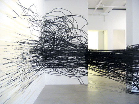 MONIKA GRZYMALA: RUPTURES 19 February � 5 April 2009 The Drawing Room is delighted to announce Monika Grzymala�s first solo exhibition in the UK. Monika Grzymala�s installations function somewhere between an architectural intervention and immense line drawings. Grzymala�s installation for The Drawing Room is a personal response to the chaotic London sky-line, to the architectural space of the gallery and to the ideas explored in the Hayward Touring exhibition, �The end of the line: attitudes in drawing�, of which this commission is part. Grzymala describes each drawing in space in terms of kilometres of used line which references the personal investment of time and energy. For Ruptures the lines will be created from sticky tape in varying tones of grey, a nod to the predominance of grey in our city. These lines will be interrupted and converge on given points, collide and ricochet, sending out reports, staccato marks to bombard other areas. Miraculously the eye will fill in the gaps, create the continuum capable of maintaining the velocity of the multiple lines. The rectilinear properties of The Drawing Room will be ruptured by the maelstrom of activity that punctuates the space. This is a site specific installation commissioned by The Drawing Room to coincide with �The end of the line: attitudes in drawing� a Hayward Touring exhibition in collaboration with mima, Middlesbrough and The Bluecoat, Liverpool in association with The Drawing Room. The work will be linked to site-specific installations created at mima, Middlesbrough, (27 February � 10 May) and Bluecoat, Liverpool (22 May - 29 July). Monika Grzymala was born in Poland in 1970 and lives and works in Berlin, Germany. Recent exhibitions include a two-person exhibition at Catriona Jeffries Gallery, Vancouver (2008); group exhibitions at Transmission Gallery, Glasgow (2007); Marian Goodman Gallery, New York (2006) & The Drawing Center, New York (2005). She has just completed a residency at the Chianti Foundation, Marfa, Texas and is currently creating site-specific work with hand-made paper for permanent display at the Dian Woodner Collection, New York. http://www.t-r-a-n-s-i-t.net/ For further information please contact Mary Doyle or Kate Macfarlane on 020 7729 5333 or mail @ drawingroom.org.uk |