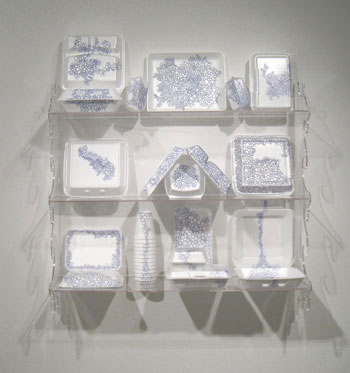 Rachel Perry Welty China Cabinet, 2009, Ballpoint ink on Styrofoam, Plexiglas shelf, 36 x 36 x 23 inches