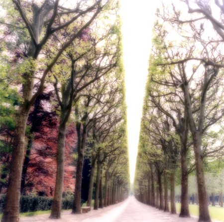Working in France, England and the United States, Geesaman�s idealized settings are a metaphor for the tenuous relationship between man and nature. Utilizing a technique of diffusion that gives her images a delicate, dewy patina, Geesaman�s constructed environments are awash in the ethereal play of color and light. Civilization is merely alluded to by the inclusion of precisely trimmed hedges and long alleys of trees, preserving an out-of-time, utopian quality in the works.