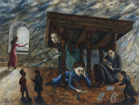 Kati Heck, Ins Büro! December 23, 2015 – January 23, 2016 Opening: Friday, December 11, 6:00-8:00pm It is with special delight that Corbett vs. Dempsey present Ins Büro!, an exhibition of new paintings, drawings, and sculpture by Kati Heck. This is the first show of the artist with CvsD and her Midwest premiere. Born in Germany, Kati Heck is based in Antwerp, Belgium. With an intense and provocative sensibility that draws on historical precedents from Surrealism to Social Realism, Heck is a painter of astonishing facility, with an alchemical sensitivity to the human form and a devilish ironic streak. Her paintings incorporate strange scenarios, often sustained for a body of work, involving particular characters based on folks she invites into her studio. The resulting images constitute their own, highly unusual and particular world, a fantasy state, some of which is crafted in dreams. Arms are transparent, strange beasts enter the scene including an ostrich serving coffee to a couple on a futon; a young man’s pronounced varicose veins are matched by the other leg, which seems to be frozen; an animated man in a rocking chair holds a ball of light in one hand, the other submerged in a jar of pickles. This new group of works, which includes a mural-sized painting with a full range of haunting and haunted characters, conjures the supernatural in various ways, invoking a spiritual and material ecosystem as singular and peculiar as it is wondrous and open. Kati Heck’s solo exhibitions include M HKA, Antwerp (forthcoming 2016), Tim Van Laere Gallery, Antwerp (2014, 2011), CAD Malaga, Malaga, Spain (2013), Galerie Mario Mauroner, Vienna (2010), tellerschiff der Stadt, Frankfurt (2010), Marc Selwyn Fine Art, Los Angeles (2009, 2006), Mary Boone Gallery, New York (2008), and Museum Het Domein, Sittart, The Netherlands (2008). Ins Büro! is accompanied by a full-color 28-page catalog with an interview of Kati Heck by John Corbett and Jim Dempsey. |